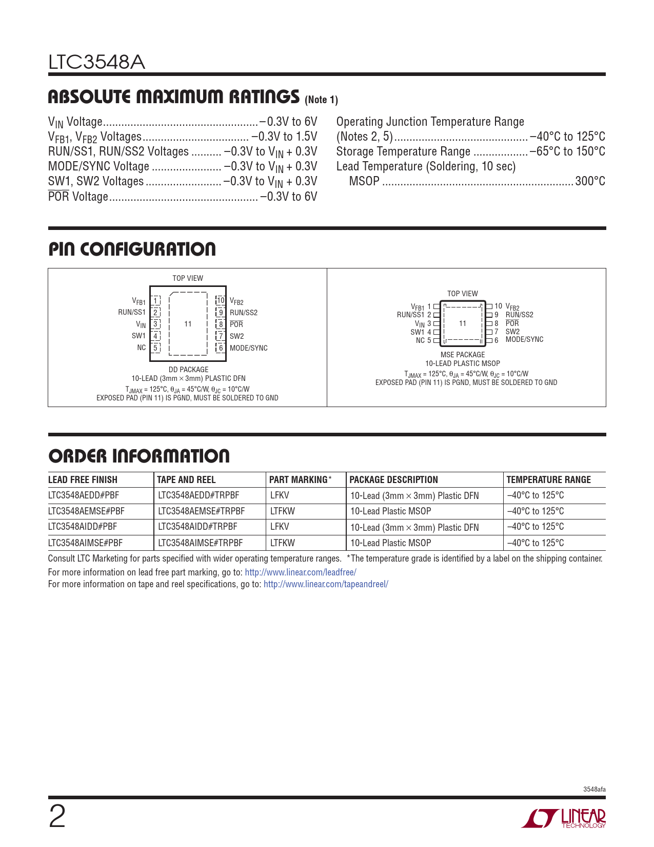 LTC3548AEDD#PBF LTC3548AEDD#TRPBF LFKV 10-Lead (3mm × 3mm) Plastic DFN –40°C to 125°C LTC3548AEMSE#PBF LTC3548AEMSE#TRPBF LTFKW 10-Lead Plastic MSOP –40°C to 125°C LTC3548AIDD#PBF LTC3548AIDD#TRPBF LFKV 10-Lead (3mm × 3mm) Plastic DFN –40°C to 125°C LTC3548AIMSE#PBF LTC3548AIMSE#TRPBF LTFKW 10-Lead Plastic MSOP –40°C to 125°C Consult LTC Marketing for parts specifi ed with wider operating temperature ranges. *The temperature grade is identifi ed by a label on the shipping container. For more information on lead free part marking, go to: http://www.linear.com/leadfree/ For more information on tape and reel specifi cations, go to: http://www.linear.com/tapeandreel/ 3548afa 2