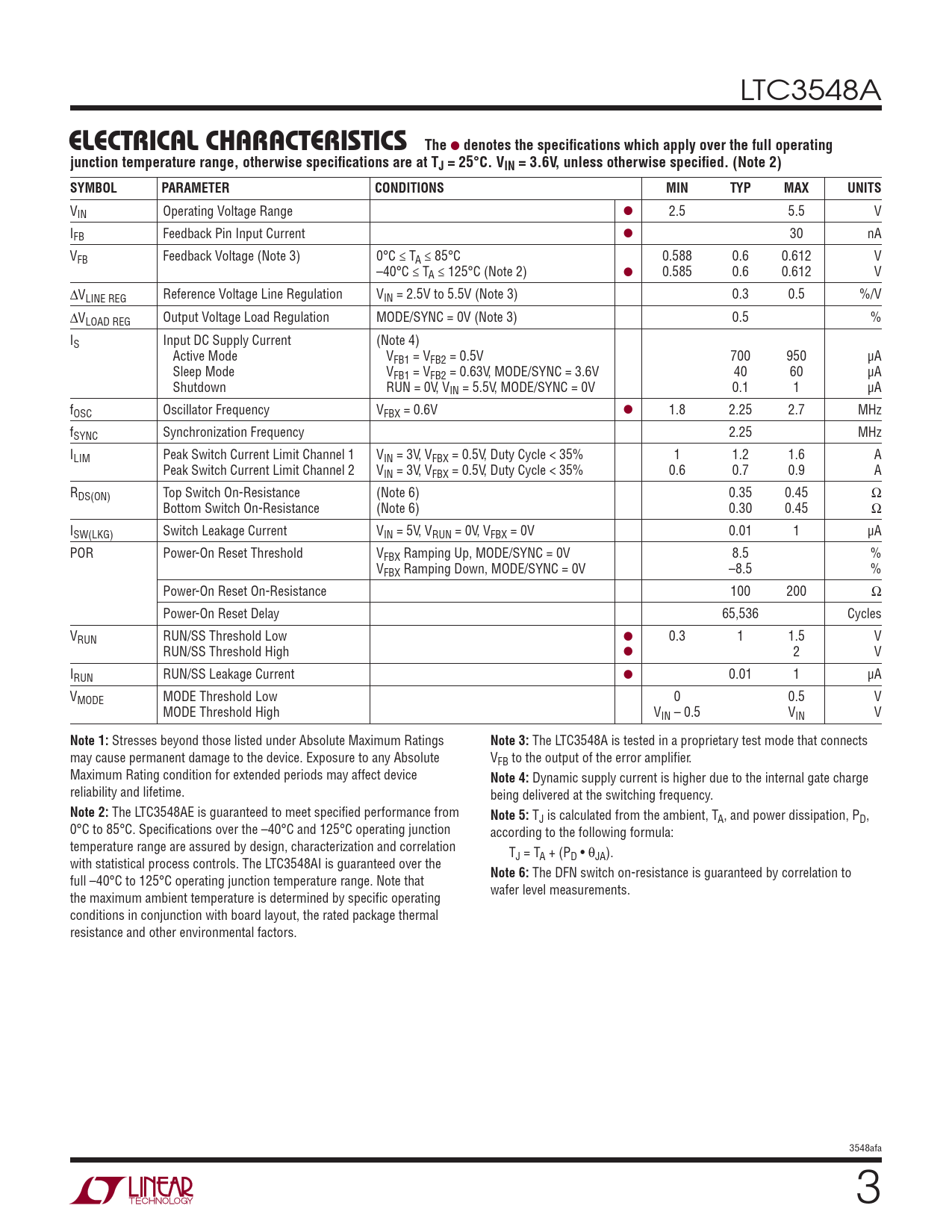 LTC3548A ELECTRICAL CHARACTERISTICS The l denotes the specifi cations which apply over the full operatingjunction temperature range, otherwise specifi cations are at TJ = 25°C. VIN = 3.6V, unless otherwise specifi ed. (Note 2)SYMBOLPARAMETERCONDITIONSMINTYPMAXUNITS VIN Operating Voltage Range ● 2.5 5.5 V IFB Feedback Pin Input Current ● 30 nA VFB Feedback Voltage (Note 3) 0°C ≤ TA ≤ 85°C 0.588 0.6 0.612 V –40°C ≤ TA ≤ 125°C (Note 2) ● 0.585 0.6 0.612 V ΔVLINE REG Reference Voltage Line Regulation VIN = 2.5V to 5.5V (Note 3) 0.3 0.5 %/V ΔVLOAD REG Output Voltage Load Regulation MODE/SYNC = 0V (Note 3) 0.5 % IS Input DC Supply Current (Note 4) Active Mode VFB1 = VFB2 = 0.5V 700 950 μA Sleep Mode VFB1 = VFB2 = 0.63V, MODE/SYNC = 3.6V 40 60 μA Shutdown RUN = 0V, VIN = 5.5V, MODE/SYNC = 0V 0.1 1 μA fOSC Oscillator Frequency VFBX = 0.6V ● 1.8 2.25 2.7 MHz fSYNC Synchronization Frequency 2.25 MHz ILIM Peak Switch Current Limit Channel 1 VIN = 3V, VFBX = 0.5V, Duty Cycle < 35% 1 1.2 1.6 A Peak Switch Current Limit Channel 2 VIN = 3V, VFBX = 0.5V, Duty Cycle < 35% 0.6 0.7 0.9 A RDS(ON) Top Switch On-Resistance (Note 6) 0.35 0.45 Ω Bottom Switch On-Resistance (Note 6) 0.30 0.45 Ω ISW(LKG) Switch Leakage Current VIN = 5V, VRUN = 0V, VFBX = 0V 0.01 1 μA POR Power-On Reset Threshold VFBX Ramping Up, MODE/SYNC = 0V 8.5 % VFBX Ramping Down, MODE/SYNC = 0V –8.5 % Power-On Reset On-Resistance 100 200 Ω Power-On Reset Delay 65,536 Cycles VRUN RUN/SS Threshold Low ● 0.3 1 1.5 V RUN/SS Threshold High ● 2 V IRUN RUN/SS Leakage Current ● 0.01 1 μA VMODE MODE Threshold Low 0 0.5 V MODE Threshold High VIN – 0.5 VIN V Note 1: Stresses beyond those listed under Absolute Maximum Ratings Note 3: The LTC3548A is tested in a proprietary test mode that connects may cause permanent damage to the device. Exposure to any Absolute VFB to the output of the error amplifier. Maximum Rating condition for extended periods may affect device Note 4: Dynamic supply current is higher due to the internal gate charge reliability and lifetime. being delivered at the switching frequency. Note 2: The LTC3548AE is guaranteed to meet specified performance from Note 5: TJ is calculated from the ambient, TA, and power dissipation, PD, 0°C to 85°C. Specifications over the –40°C and 125°C operating junction according to the following formula: temperature range are assured by design, characterization and correlation TJ = TA + (PD • θJA). with statistical process controls. The LTC3548AI is guaranteed over the Note 6: The DFN switch on-resistance is guaranteed by correlation to full –40°C to 125°C operating junction temperature range. Note that wafer level measurements. the maximum ambient temperature is determined by specific operating conditions in conjunction with board layout, the rated package thermal resistance and other environmental factors. 3548afa 3