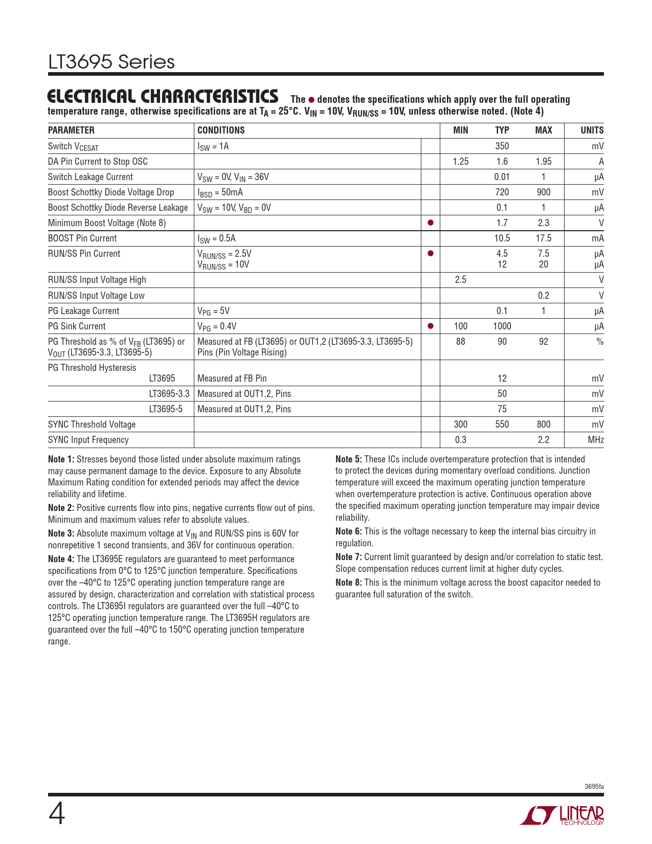Switch VCESAT ISW = 1A 350 mV DA Pin Current to Stop OSC 1.25 1.6 1.95 A Switch Leakage Current VSW = 0V, VIN = 36V 0.01 1 μA Boost Schottky Diode Voltage Drop IBSD = 50mA 720 900 mV Boost Schottky Diode Reverse Leakage VSW = 10V, VBD = 0V 0.1 1 μA Minimum Boost Voltage (Note 8) l 1.7 2.3 V BOOST Pin Current ISW = 0.5A 10.5 17.5 mA RUN/SS Pin Current VRUN/SS = 2.5V l 4.5 7.5 μA VRUN/SS = 10V 12 20 μA RUN/SS Input Voltage High 2.5 V RUN/SS Input Voltage Low 0.2 V PG Leakage Current VPG = 5V 0.1 1 μA PG Sink Current VPG = 0.4V l 100 1000 μA PG Threshold as % of VFB (LT3695) or Measured at FB (LT3695) or OUT1,2 (LT3695-3.3, LT3695-5) 88 90 92 % VOUT (LT3695-3.3, LT3695-5) Pins (Pin Voltage Rising) PG Threshold Hysteresis LT3695 Measured at FB Pin 12 mV LT3695-3.3 Measured at OUT1,2, Pins 50 mV LT3695-5 Measured at OUT1,2, Pins 75 mV SYNC Threshold Voltage 300 550 800 mV SYNC Input Frequency 0.3 2.2 MHz