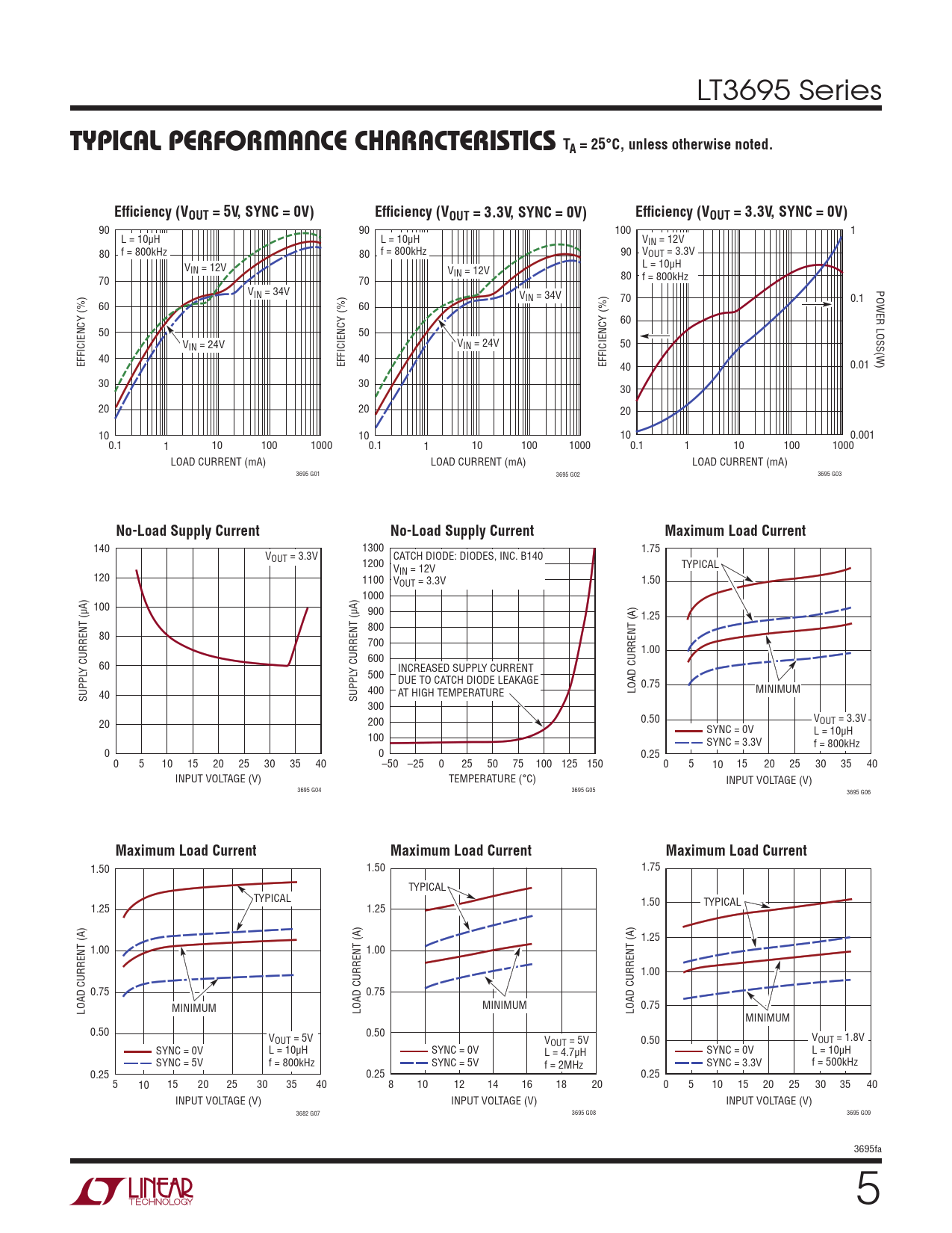 140 1300 1.75 V CATCH DIODE: DIODES, INC. B140 OUT = 3.3V 1200 TYPICAL VIN = 12V 120 1100 V 1.50 OUT = 3.3V 1000 100 900 1.25 800 80 700 1.00 600 Y CURRENT (μA) 60 Y CURRENT (μA) INCREASED SUPPLY CURRENT 500 DUE TO CATCH DIODE LEAKAGE 0.75 400 LOAD CURRENT (A) MINIMUM SUPPL 40 SUPPL AT HIGH TEMPERATURE 300 0.50 V 200 OUT = 3.3V 20 SYNC = 0V L = 10μH 100 SYNC = 3.3V f = 800kHz 0 0 0.25 0 5 10 15 20 25 30 35 40 –50 –25 0 25 50 75 100 125 150 0 5 10 15 20 25 30 35 40 INPUT VOLTAGE (V) TEMPERATURE (°C) INPUT VOLTAGE (V) 3695 G04 3695 G05 3695 G06