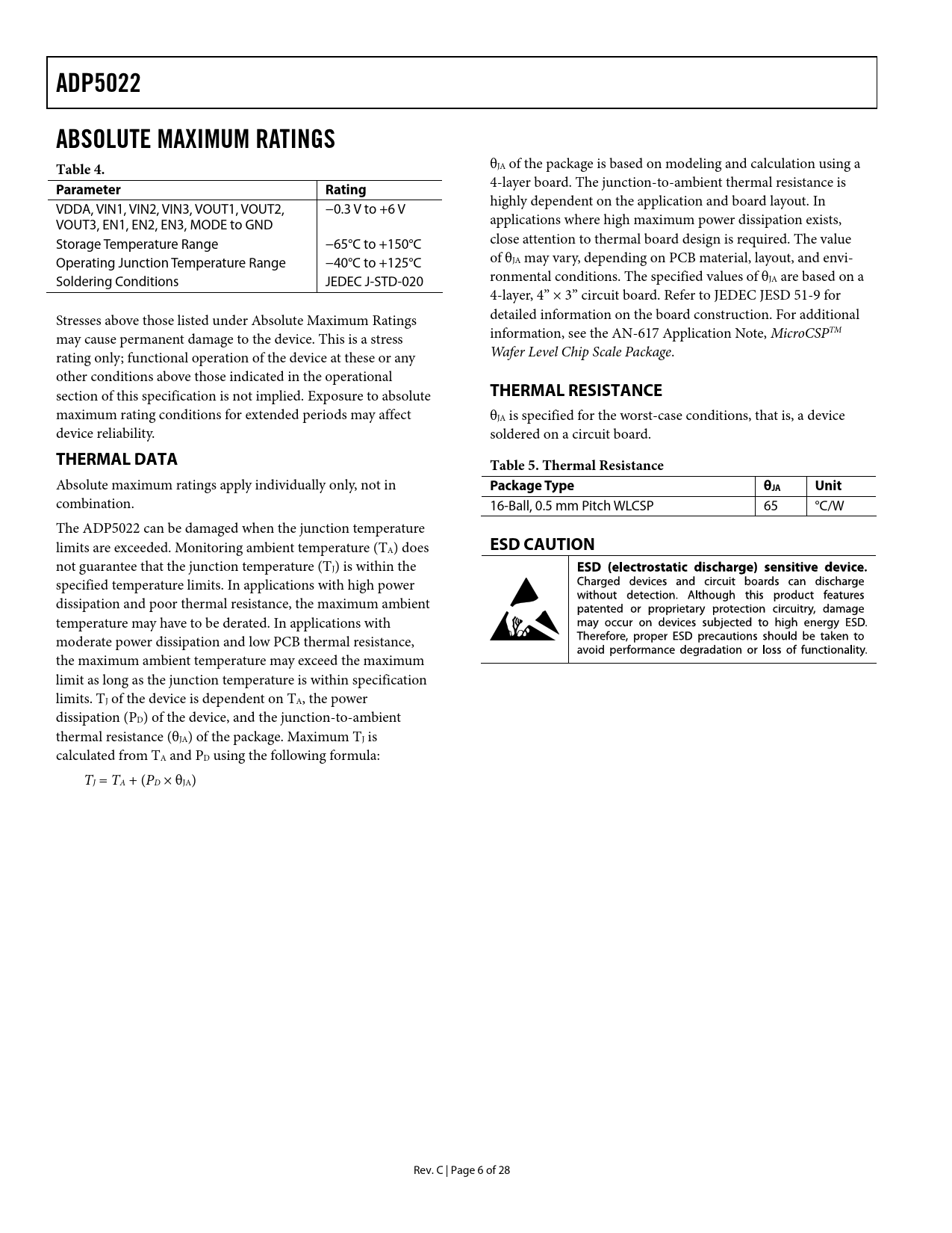 ADP5022ABSOLUTE MAXIMUM RATINGS Table 4. θJA of the package is based on modeling and calculation using a 4-layer board. The junction-to-ambient thermal resistance is Parameter Rating highly dependent on the application and board layout. In VDDA, VIN1, VIN2, VIN3, VOUT1, VOUT2, −0.3 V to +6 V VOUT3, EN1, EN2, EN3, MODE to GND applications where high maximum power dissipation exists, Storage Temperature Range −65°C to +150°C close attention to thermal board design is required. The value Operating Junction Temperature Range −40°C to +125°C of θJA may vary, depending on PCB material, layout, and envi- Soldering Conditions JEDEC J-STD-020 ronmental conditions. The specified values of θJA are based on a 4-layer, 4” × 3” circuit board. Refer to JEDEC JESD 51-9 for Stresses above those listed under Absolute Maximum Ratings detailed information on the board construction. For additional may cause permanent damage to the device. This is a stress information, see the AN-617 Application Note, MicroCSPTM rating only; functional operation of the device at these or any Wafer Level Chip Scale Package. other conditions above those indicated in the operational section of this specification is not implied. Exposure to absolute THERMAL RESISTANCE maximum rating conditions for extended periods may affect θJA is specified for the worst-case conditions, that is, a device device reliability. soldered on a circuit board. THERMAL DATATable 5. Thermal Resistance Absolute maximum ratings apply individually only, not in Package TypeθJA Unit combination. 16-Ball, 0.5 mm Pitch WLCSP 65 °C/W The ADP5022 can be damaged when the junction temperature limits are exceeded. Monitoring ambient temperature (T ESD CAUTION A) does not guarantee that the junction temperature (TJ) is within the specified temperature limits. In applications with high power dissipation and poor thermal resistance, the maximum ambient temperature may have to be derated. In applications with moderate power dissipation and low PCB thermal resistance, the maximum ambient temperature may exceed the maximum limit as long as the junction temperature is within specification limits. TJ of the device is dependent on TA, the power dissipation (PD) of the device, and the junction-to-ambient thermal resistance (θJA) of the package. Maximum TJ is calculated from TA and PD using the following formula: TJ = TA + (PD × θJA) Rev. C | Page 6 of 28 Document Outline FEATURES APPLICATIONS GENERAL DESCRIPTION TABLE OF CONTENTS REVISION HISTORY SPECIFICATIONS BUCK1 AND BUCK2 SPECIFICATIONS LDO SPECIFICATIONS ABSOLUTE MAXIMUM RATINGS THERMAL DATA THERMAL RESISTANCE ESD CAUTION PIN CONFIGURATION AND FUNCTION DESCRIPTIONS TYPICAL PERFORMANCE CHARACTERISTICS THEORY OF OPERATION POWER MANAGEMENT UNIT Thermal Protection Undervoltage Lockout Enable/Shutdown BUCK SECTION Control Scheme PWM Mode Power Save Mode (PSM) PSM Current Threshold Oscillator/Phasing of Inductor Switching Enable/Shutdown Short-Circuit Protection Soft Start Current Limit 100% Duty Operation LDO SECTION LDO Undervoltage Lockout APPLICATIONS INFORMATION BUCK EXTERNAL COMPONENT SELECTION Inductor Output Capacitor Input Capacitor LDO CAPACITOR SELECTION Output Capacitor Input Bypass Capacitor Input and Output Capacitor Properties PCB LAYOUT GUIDELINES EVALUATION BOARD SCHEMATICS AND ARTWORK SUGGESTED LAYOUT OUTLINE DIMENSIONS ORDERING GUIDE