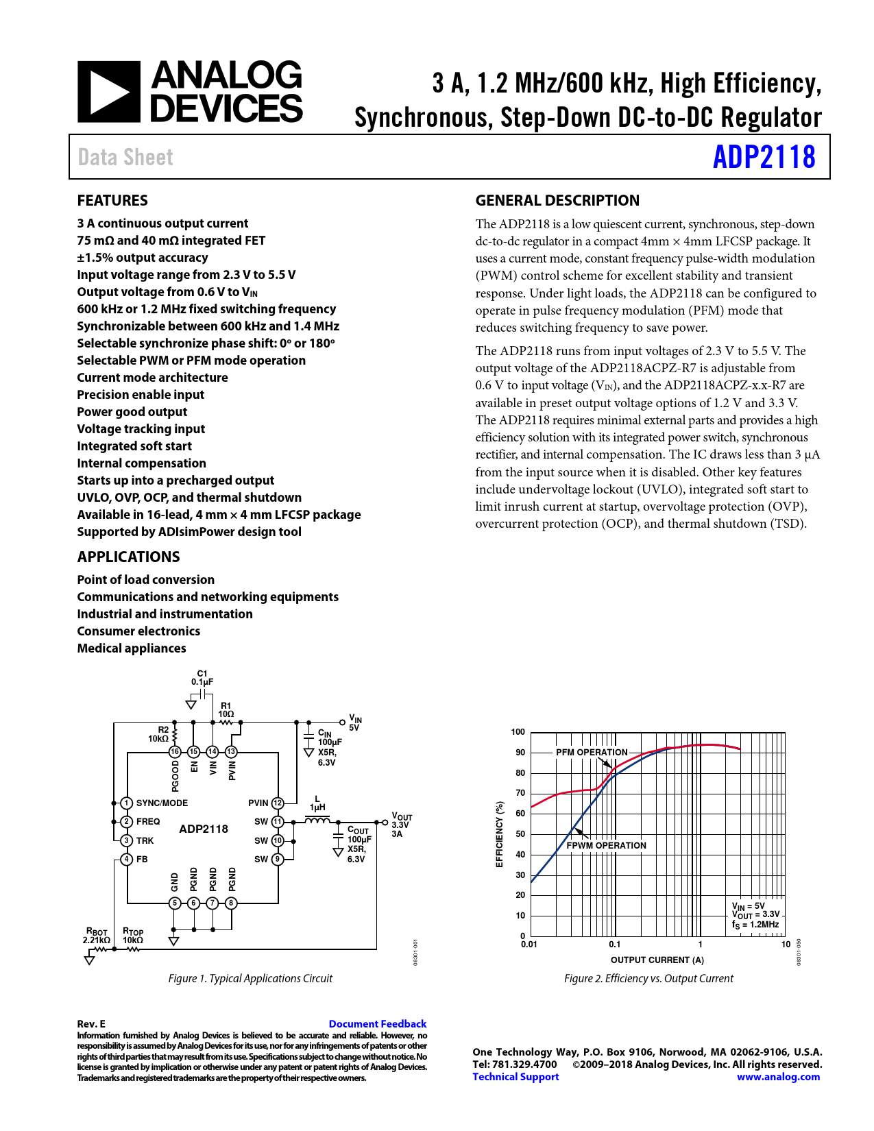 3 A, 1.2 MHz/600 kHz, High Efficiency, Synchronous, Step-Down DC-to-DC Regulator Data Sheet ADP2118 FEATURES GENERAL DESCRIPTION 3 A continuous output current
