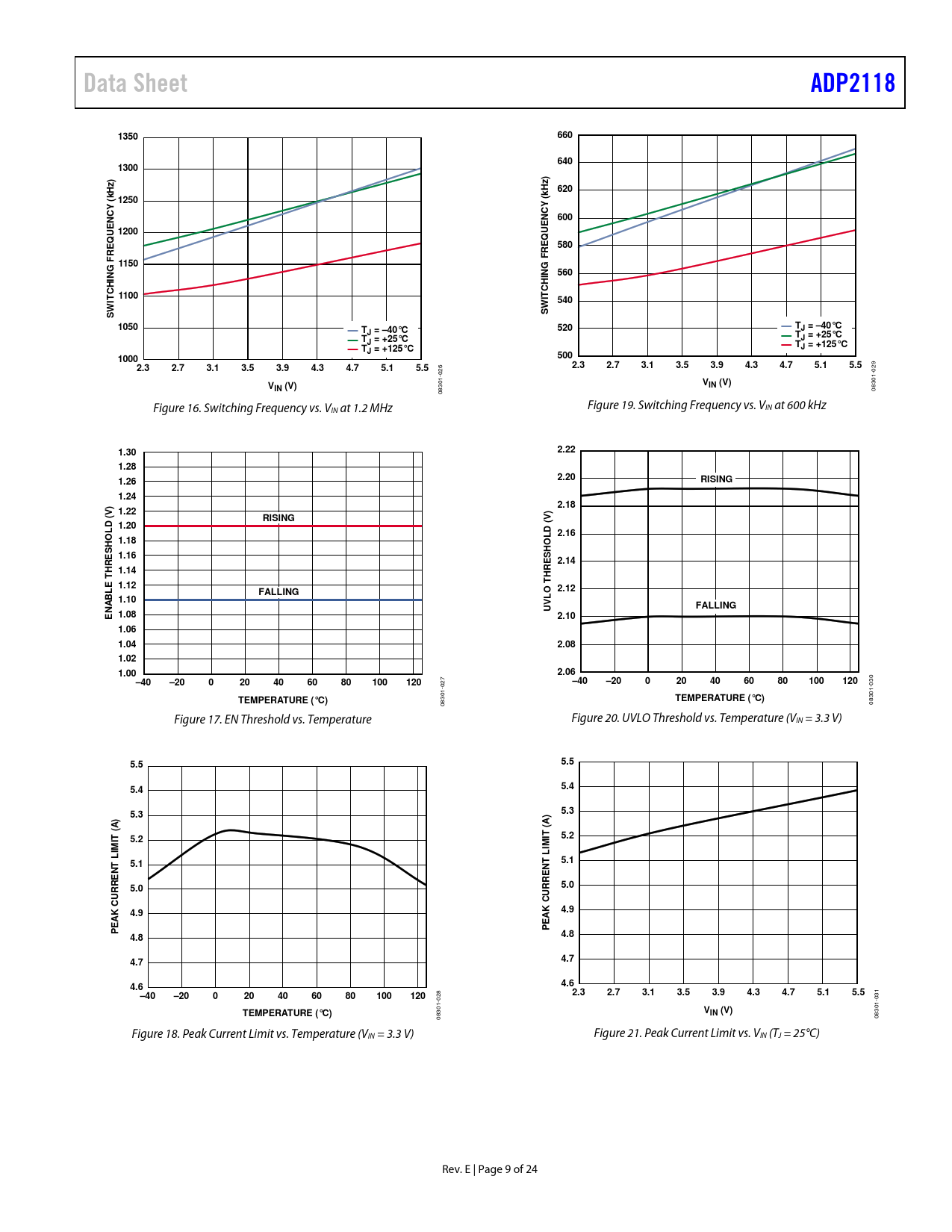 Data SheetADP211813506606401300))620kHzkHz( 1250(YYNCNC600UE 1200UEQQ580REREFF1150NGNG560CHICHI1100ITIT540WWSS1050TT520J = –40°CJ = –40°CTTJ = +25°CJ = +25°CTTJ = +125°CJ = +125°C10005002.32.73.13.53.94.34.75.15.52.32.73.13.53.94.34.75.15.5 029 026 VVIN (V)IN (V) 08301- 08301- Figure 16. Switching Frequency vs. V Figure 19. Switching Frequency vs. V IN at 1.2 MHz IN at 600 kHz 1.302.221.282.201.26RISING1.24)2.18V 1.22)RISINGVD ( 1.20LD ( 2.16L1.18HO SHO1.16S 2.14HRE 1.14THREE 1.12TFALLINGO 2.121.10LFALLINGNABLUV1.08E2.101.061.042.081.021.002.06–40–20020406080100120–40–20020406080100120 027 030 TEMPERATURE (°C)TEMPERATURE (°C) 08301- 08301- Figure 17. EN Threshold vs. Temperature Figure 20. UVLO Threshold vs. Temperature (VIN = 3.3 V) 5.55.55.45.45.35.3A)A)((IT5.2IT5.2IMIMLL5.15.1NTNT5.05.04.94.9AK CURREAK CURREEEPP4.84.84.74.74.64.6–40–200204060801001202.32.73.13.53.94.34.75.15.5 028 031 TEMPERATURE (°C)VIN (V) 08301- 08301- Figure 18. Peak Current Limit vs. Temperature (VIN = 3.3 V) Figure 21. Peak Current Limit vs. VIN (TJ = 25°C) Rev. E | Page 9 of 24 Document Outline Features Applications General Description Revision History Specifications Absolute Maximum Ratings Thermal Resistance Boundary Conditions ESD Caution Pin Configuration and Function Descriptions Typical Performance Characteristics Functional Block Diagram Theory of Operation Control Scheme PWM Mode Operation PFM Mode Operation Slope Compensation Enable/Shutdown Integrated Soft Start Tracking Oscillator and Synchronization Current Limit and Short-Circuit Protection Overvoltage Protection (OVP) Undervoltage Lockout (UVLO) Thermal Shutdown Power Good Applications Information ADIsimPower™ Design Tool Output Voltage Selection Inductor Selection Output Capacitor Selection Input Capacitor Selection Voltage Tracking Typical Application Circuits Outline Dimensions Ordering Guide