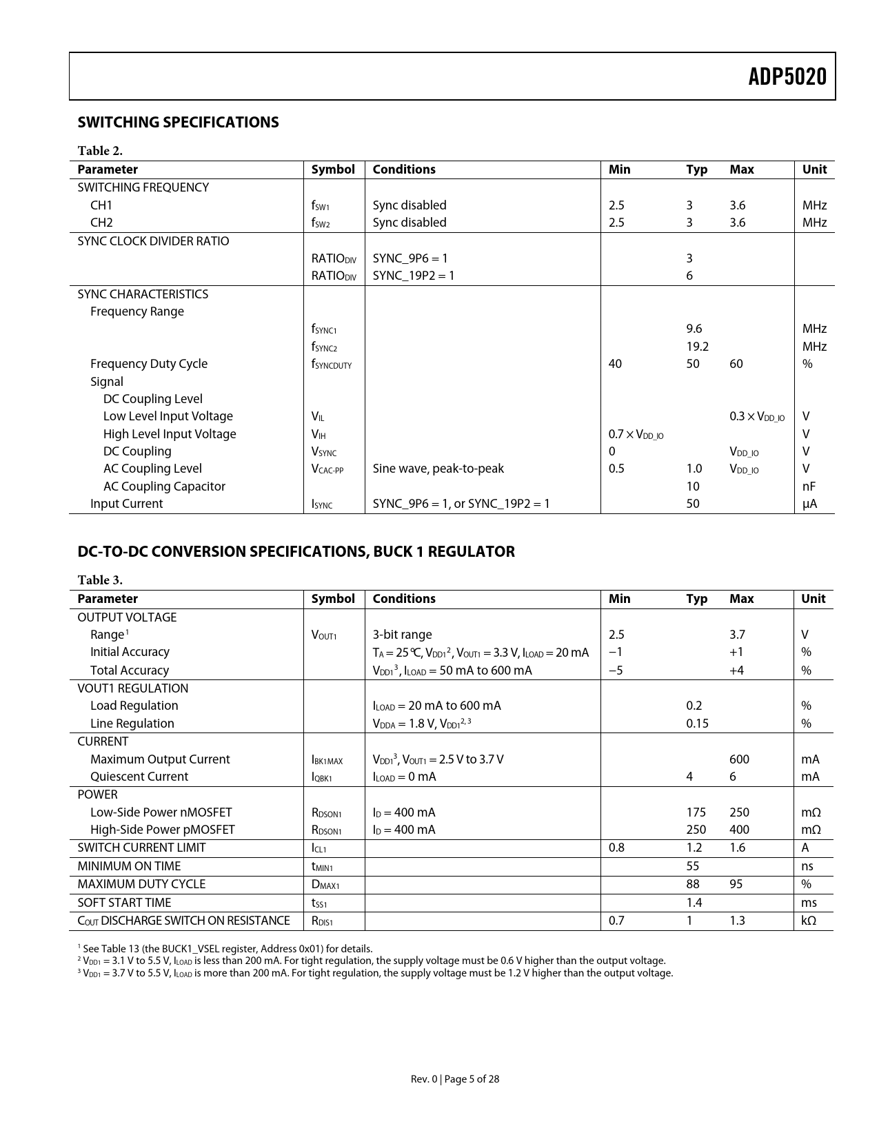 link to page 28 link to page 28 link to page 28 link to page 5 link to page 5 link to page 5 link to page 5 link to page 5 link to page 5 link to page 5 link to page 5 link to page 14 ADP5020SWITCHING SPECIFICATIONSTable 2. Parameter SymbolConditions MinTypMaxUnit SWITCHING FREQUENCY CH1 fSW1 Sync disabled 2.5 3 3.6 MHz CH2 fSW2 Sync disabled 2.5 3 3.6 MHz SYNC CLOCK DIVIDER RATIO RATIODIV SYNC_9P6 = 1 3 RATIODIV SYNC_19P2 = 1 6 SYNC CHARACTERISTICS Frequency Range fSYNC1 9.6 MHz fSYNC2 19.2 MHz Frequency Duty Cycle fSYNCDUTY 40 50 60 % Signal DC Coupling Level Low Level Input Voltage VIL 0.3 × VDD_IO V High Level Input Voltage VIH 0.7 × VDD_IO V DC Coupling VSYNC 0 VDD_IO V AC Coupling Level VCAC-PP Sine wave, peak-to-peak 0.5 1.0 VDD_IO V AC Coupling Capacitor 10 nF Input Current ISYNC SYNC_9P6 = 1, or SYNC_19P2 = 1 50 μA DC-TO-DC CONVERSION SPECIFICATIONS, BUCK 1 REGULATORTable 3. Parameter SymbolConditions MinTypMaxUnit OUTPUT VOLTAGE Range1 VOUT1 3-bit range 2.5 3.7 V Initial Accuracy T 2 A = 25°C, VDD1 , VOUT1 = 3.3 V, ILOAD = 20 mA −1 +1 % Total Accuracy V 3 DD1 , ILOAD = 50 mA to 600 mA −5 +4 % VOUT1 REGULATION Load Regulation ILOAD = 20 mA to 600 mA 0.2 % Line Regulation V 2, 3 DDA = 1.8 V, VDD1 0.15 % CURRENT Maximum Output Current I 3 BK1MAX VDD1 , VOUT1 = 2.5 V to 3.7 V 600 mA Quiescent Current IQBK1 ILOAD = 0 mA 4 6 mA POWER Low-Side Power nMOSFET RDSON1 ID = 400 mA 175 250 mΩ High-Side Power pMOSFET RDSON1 ID = 400 mA 250 400 mΩ SWITCH CURRENT LIMIT ICL1 0.8 1.2 1.6 A MINIMUM ON TIME tMIN1 55 ns MAXIMUM DUTY CYCLE DMAX1 88 95 % SOFT START TIME tSS1 1.4 ms COUT DISCHARGE SWITCH ON RESISTANCE RDIS1 0.7 1 1.3 kΩ 1 See Tabl (t e 13 he BUCK1_VSEL register, Address 0x01) for details. 2 VDD1 = 3.1 V to 5.5 V, ILOAD is less than 200 mA. For tight regulation, the supply voltage must be 0.6 V higher than the output voltage. 3 VDD1 = 3.7 V to 5.5 V, ILOAD is more than 200 mA. For tight regulation, the supply voltage must be 1.2 V higher than the output voltage. Rev. 0 | Page 5 of 28 Document Outline FEATURES APPLICATIONS TYPICAL APPLICATIONS CIRCUIT GENERAL DESCRIPTION TABLE OF CONTENTS REVISION HISTORY FUNCTIONAL BLOCK DIAGRAM SPECIFICATIONS SWITCHING SPECIFICATIONS DC-TO-DC CONVERSION SPECIFICATIONS, BUCK 1 REGULATOR DC-TO-DC CONVERSION SPECIFICATIONS, BUCK 2 REGULATOR VOUT3 SPECIFICATIONS, LOW DROPOUT (LDO) REGULATOR I2C TIMING SPECIFICATIONS Timing Diagram ABSOLUTE MAXIMUM RATINGS THERMAL RESISTANCE Thermal Data ESD CAUTION PIN CONFIGURATION AND FUNCTION DESCRIPTIONS TYPICAL PERFORMANCE CHARACTERISTICS THEORY OF OPERATION CIRCUIT OPERATION INTERNAL COMPENSATION CURRENT LIMITING AND SHORT-CIRCUIT PROTECTION SYNCHRONIZATION I2C INTERFACE UNDERVOLTAGE LOCKOUT THERMAL SHUTDOWN CONTROL REGISTERS DEVICE ADDRESS REGISTER MAP REGISTER DESCRIPTIONS User Accessible Registers POWER-UP/POWER-DOWN SEQUENCE SEQUENCER DEFAULT POWER-ON SEQUENCE WITH EN PIN Activation Waveforms POWER-ON SEQUENCE USING THE I2C INTERFACE POWER-UP/POWER-DOWN STATE FLOW APPLICATIONS INFORMATION POWER GOOD STATUS XSHTDN LOGIC COMPONENTS SELECTION Buck Inductor Input Capacitor Selection Output Capacitor Selection LDO INPUT FILTER LAYOUT RECOMMENDATIONS APPLICATIONS SCHEMATIC PCB BOARD LAYOUT RECOMMENDATIONS EXTERNAL COMPONENT LIST OUTLINE DIMENSIONS ORDERING GUIDE