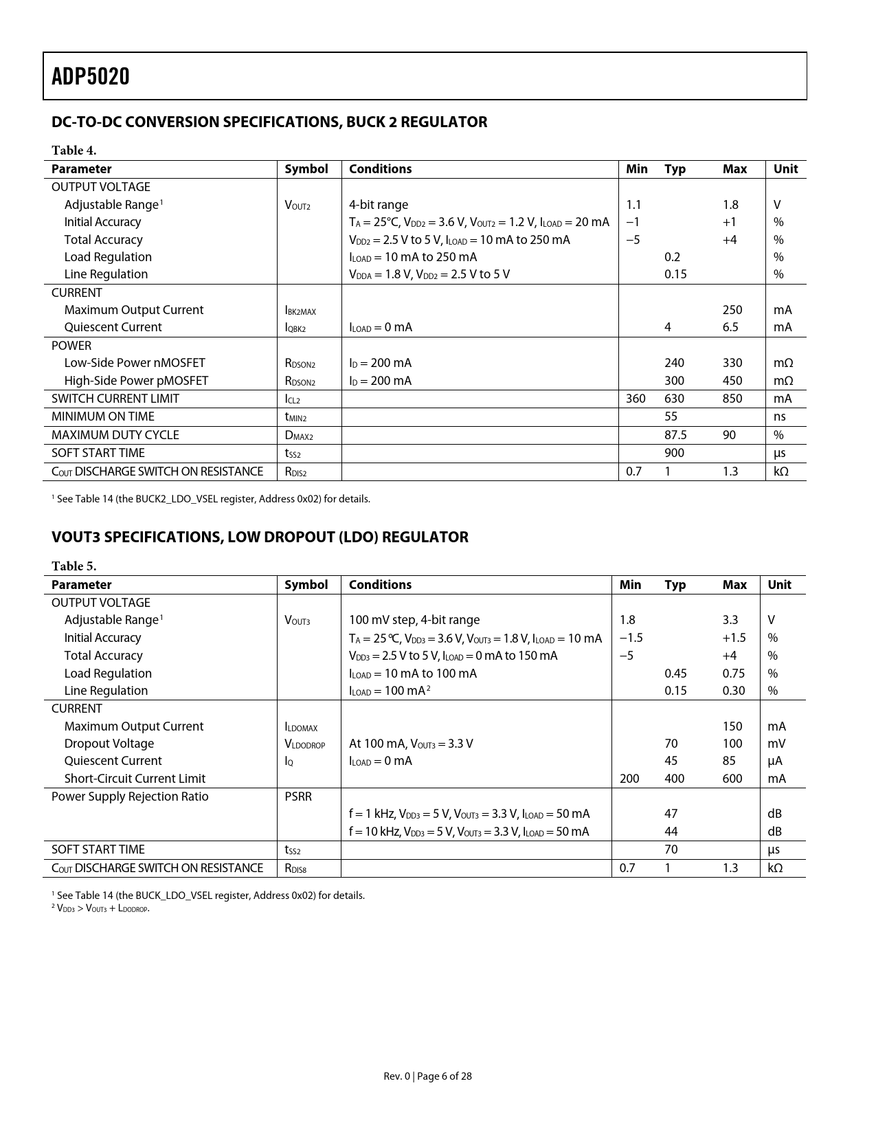 link to page 28 link to page 28 link to page 28 link to page 6 link to page 6 link to page 6 link to page 15 link to page 15 ADP5020DC-TO-DC CONVERSION SPECIFICATIONS, BUCK 2 REGULATORTable 4. Parameter SymbolConditionsMinTypMaxUnit OUTPUT VOLTAGE Adjustable Range1 VOUT2 4-bit range 1.1 1.8 V Initial Accuracy TA = 25°C, VDD2 = 3.6 V, VOUT2 = 1.2 V, ILOAD = 20 mA −1 +1 % Total Accuracy VDD2 = 2.5 V to 5 V, ILOAD = 10 mA to 250 mA −5 +4 % Load Regulation ILOAD = 10 mA to 250 mA 0.2 % Line Regulation VDDA = 1.8 V, VDD2 = 2.5 V to 5 V 0.15 % CURRENT Maximum Output Current IBK2MAX 250 mA Quiescent Current IQBK2 ILOAD = 0 mA 4 6.5 mA POWER Low-Side Power nMOSFET RDSON2 ID = 200 mA 240 330 mΩ High-Side Power pMOSFET RDSON2 ID = 200 mA 300 450 mΩ SWITCH CURRENT LIMIT ICL2 360 630 850 mA MINIMUM ON TIME tMIN2 55 ns MAXIMUM DUTY CYCLE DMAX2 87.5 90 % SOFT START TIME tSS2 900 μs COUT DISCHARGE SWITCH ON RESISTANCE RDIS2 0.7 1 1.3 kΩ 1 See Tabl (t e 14 he BUCK2_LDO_VSEL register, Address 0x02) for details. VOUT3 SPECIFICATIONS, LOW DROPOUT (LDO) REGULATORTable 5. Parameter SymbolConditionsMinTypMaxUnit OUTPUT VOLTAGE Adjustable Range1 VOUT3 100 mV step, 4-bit range 1.8 3.3 V Initial Accuracy TA = 25°C, VDD3 = 3.6 V, VOUT3 = 1.8 V, ILOAD = 10 mA −1.5 +1.5 % Total Accuracy VDD3 = 2.5 V to 5 V, ILOAD = 0 mA to 150 mA −5 +4 % Load Regulation ILOAD = 10 mA to 100 mA 0.45 0.75 % Line Regulation ILOAD = 100 mA2 0.15 0.30 % CURRENT Maximum Output Current ILDOMAX 150 mA Dropout Voltage VLDODROP At 100 mA, VOUT3 = 3.3 V 70 100 mV Quiescent Current IQ ILOAD = 0 mA 45 85 μA Short-Circuit Current Limit 200 400 600 mA Power Supply Rejection Ratio PSRR f = 1 kHz, VDD3 = 5 V, VOUT3 = 3.3 V, ILOAD = 50 mA 47 dB f = 10 kHz, VDD3 = 5 V, VOUT3 = 3.3 V, ILOAD = 50 mA 44 dB SOFT START TIME tSS2 70 μs COUT DISCHARGE SWITCH ON RESISTANCE RDIS8 0.7 1 1.3 kΩ 1 See Tabl (t e 14 he BUCK_LDO_VSEL register, Address 0x02) for details. 2 VDD3 > VOUT3 + LDODROP. Rev. 0 | Page 6 of 28 Document Outline FEATURES APPLICATIONS TYPICAL APPLICATIONS CIRCUIT GENERAL DESCRIPTION TABLE OF CONTENTS REVISION HISTORY FUNCTIONAL BLOCK DIAGRAM SPECIFICATIONS SWITCHING SPECIFICATIONS DC-TO-DC CONVERSION SPECIFICATIONS, BUCK 1 REGULATOR DC-TO-DC CONVERSION SPECIFICATIONS, BUCK 2 REGULATOR VOUT3 SPECIFICATIONS, LOW DROPOUT (LDO) REGULATOR I2C TIMING SPECIFICATIONS Timing Diagram ABSOLUTE MAXIMUM RATINGS THERMAL RESISTANCE Thermal Data ESD CAUTION PIN CONFIGURATION AND FUNCTION DESCRIPTIONS TYPICAL PERFORMANCE CHARACTERISTICS THEORY OF OPERATION CIRCUIT OPERATION INTERNAL COMPENSATION CURRENT LIMITING AND SHORT-CIRCUIT PROTECTION SYNCHRONIZATION I2C INTERFACE UNDERVOLTAGE LOCKOUT THERMAL SHUTDOWN CONTROL REGISTERS DEVICE ADDRESS REGISTER MAP REGISTER DESCRIPTIONS User Accessible Registers POWER-UP/POWER-DOWN SEQUENCE SEQUENCER DEFAULT POWER-ON SEQUENCE WITH EN PIN Activation Waveforms POWER-ON SEQUENCE USING THE I2C INTERFACE POWER-UP/POWER-DOWN STATE FLOW APPLICATIONS INFORMATION POWER GOOD STATUS XSHTDN LOGIC COMPONENTS SELECTION Buck Inductor Input Capacitor Selection Output Capacitor Selection LDO INPUT FILTER LAYOUT RECOMMENDATIONS APPLICATIONS SCHEMATIC PCB BOARD LAYOUT RECOMMENDATIONS EXTERNAL COMPONENT LIST OUTLINE DIMENSIONS ORDERING GUIDE