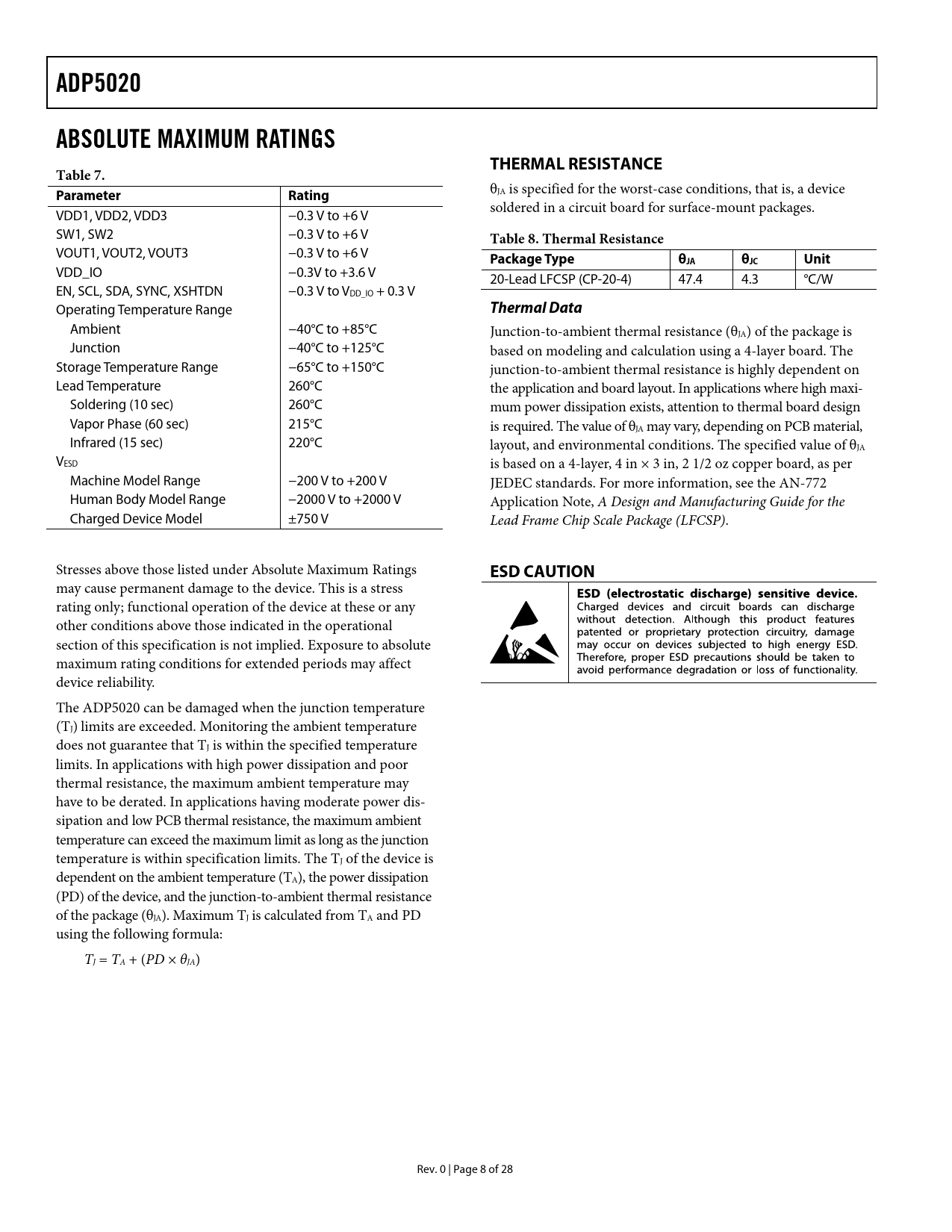ADP5020ABSOLUTE MAXIMUM RATINGSTHERMAL RESISTANCETable 7. θ Parameter Rating JA is specified for the worst-case conditions, that is, a device soldered in a circuit board for surface-mount packages. VDD1, VDD2, VDD3 −0.3 V to +6 V SW1, SW2 −0.3 V to +6 V Table 8. Thermal Resistance VOUT1, VOUT2, VOUT3 −0.3 V to +6 V Package TypeθJAθJC Unit VDD_IO −0.3V to +3.6 V 20-Lead LFCSP (CP-20-4) 47.4 4.3 °C/W EN, SCL, SDA, SYNC, XSHTDN −0.3 V to VDD_IO + 0.3 V Operating Temperature Range Thermal Data Ambient −40°C to +85°C Junction-to-ambient thermal resistance (θJA) of the package is Junction −40°C to +125°C based on modeling and calculation using a 4-layer board. The Storage Temperature Range −65°C to +150°C junction-to-ambient thermal resistance is highly dependent on Lead Temperature 260°C the application and board layout. In applications where high maxi- Soldering (10 sec) 260°C mum power dissipation exists, attention to thermal board design Vapor Phase (60 sec) 215°C is required. The value of θJA may vary, depending on PCB material, Infrared (15 sec) 220°C layout, and environmental conditions. The specified value of θJA VESD is based on a 4-layer, 4 in × 3 in, 2 1/2 oz copper board, as per Machine Model Range −200 V to +200 V JEDEC standards. For more information, see the AN-772 Human Body Model Range −2000 V to +2000 V Application Note, A Design and Manufacturing Guide for the Charged Device Model ±750 V Lead Frame Chip Scale Package (LFCSP). Stresses above those listed under Absolute Maximum Ratings ESD CAUTION may cause permanent damage to the device. This is a stress rating only; functional operation of the device at these or any other conditions above those indicated in the operational section of this specification is not implied. Exposure to absolute maximum rating conditions for extended periods may affect device reliability. The ADP5020 can be damaged when the junction temperature (TJ) limits are exceeded. Monitoring the ambient temperature does not guarantee that TJ is within the specified temperature limits. In applications with high power dissipation and poor thermal resistance, the maximum ambient temperature may have to be derated. In applications having moderate power dis- sipation and low PCB thermal resistance, the maximum ambient temperature can exceed the maximum limit as long as the junction temperature is within specification limits. The TJ of the device is dependent on the ambient temperature (TA), the power dissipation (PD) of the device, and the junction-to-ambient thermal resistance of the package (θJA). Maximum TJ is calculated from TA and PD using the following formula: TJ = TA + (PD × θJA) Rev. 0 | Page 8 of 28 Document Outline FEATURES APPLICATIONS TYPICAL APPLICATIONS CIRCUIT GENERAL DESCRIPTION TABLE OF CONTENTS REVISION HISTORY FUNCTIONAL BLOCK DIAGRAM SPECIFICATIONS SWITCHING SPECIFICATIONS DC-TO-DC CONVERSION SPECIFICATIONS, BUCK 1 REGULATOR DC-TO-DC CONVERSION SPECIFICATIONS, BUCK 2 REGULATOR VOUT3 SPECIFICATIONS, LOW DROPOUT (LDO) REGULATOR I2C TIMING SPECIFICATIONS Timing Diagram ABSOLUTE MAXIMUM RATINGS THERMAL RESISTANCE Thermal Data ESD CAUTION PIN CONFIGURATION AND FUNCTION DESCRIPTIONS TYPICAL PERFORMANCE CHARACTERISTICS THEORY OF OPERATION CIRCUIT OPERATION INTERNAL COMPENSATION CURRENT LIMITING AND SHORT-CIRCUIT PROTECTION SYNCHRONIZATION I2C INTERFACE UNDERVOLTAGE LOCKOUT THERMAL SHUTDOWN CONTROL REGISTERS DEVICE ADDRESS REGISTER MAP REGISTER DESCRIPTIONS User Accessible Registers POWER-UP/POWER-DOWN SEQUENCE SEQUENCER DEFAULT POWER-ON SEQUENCE WITH EN PIN Activation Waveforms POWER-ON SEQUENCE USING THE I2C INTERFACE POWER-UP/POWER-DOWN STATE FLOW APPLICATIONS INFORMATION POWER GOOD STATUS XSHTDN LOGIC COMPONENTS SELECTION Buck Inductor Input Capacitor Selection Output Capacitor Selection LDO INPUT FILTER LAYOUT RECOMMENDATIONS APPLICATIONS SCHEMATIC PCB BOARD LAYOUT RECOMMENDATIONS EXTERNAL COMPONENT LIST OUTLINE DIMENSIONS ORDERING GUIDE