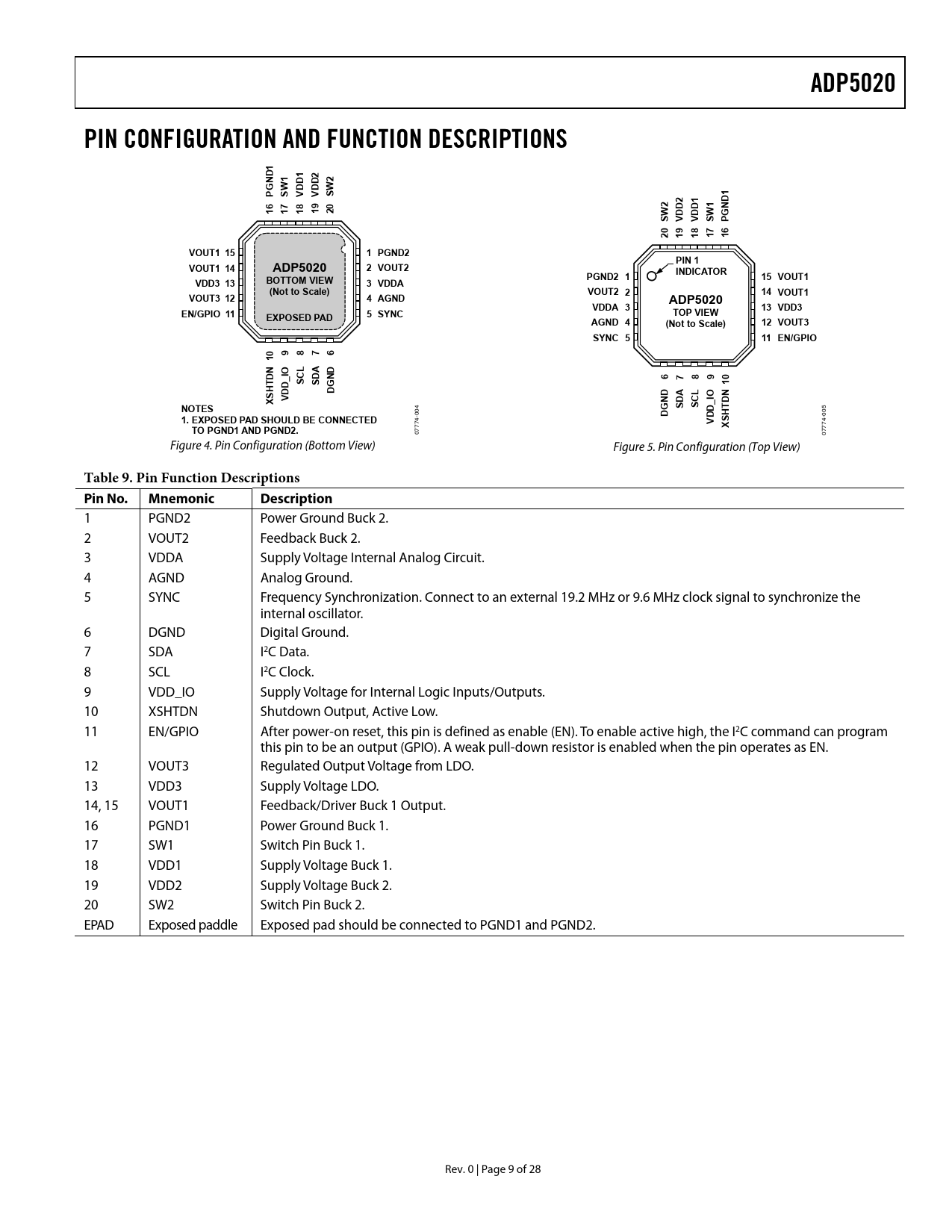 页数 / 页28 / 9 — ADP5020. PIN CONFIGURATION AND FUNCTION DESCRIPTIONS. 1 D. VOUT1 15. 1 …
