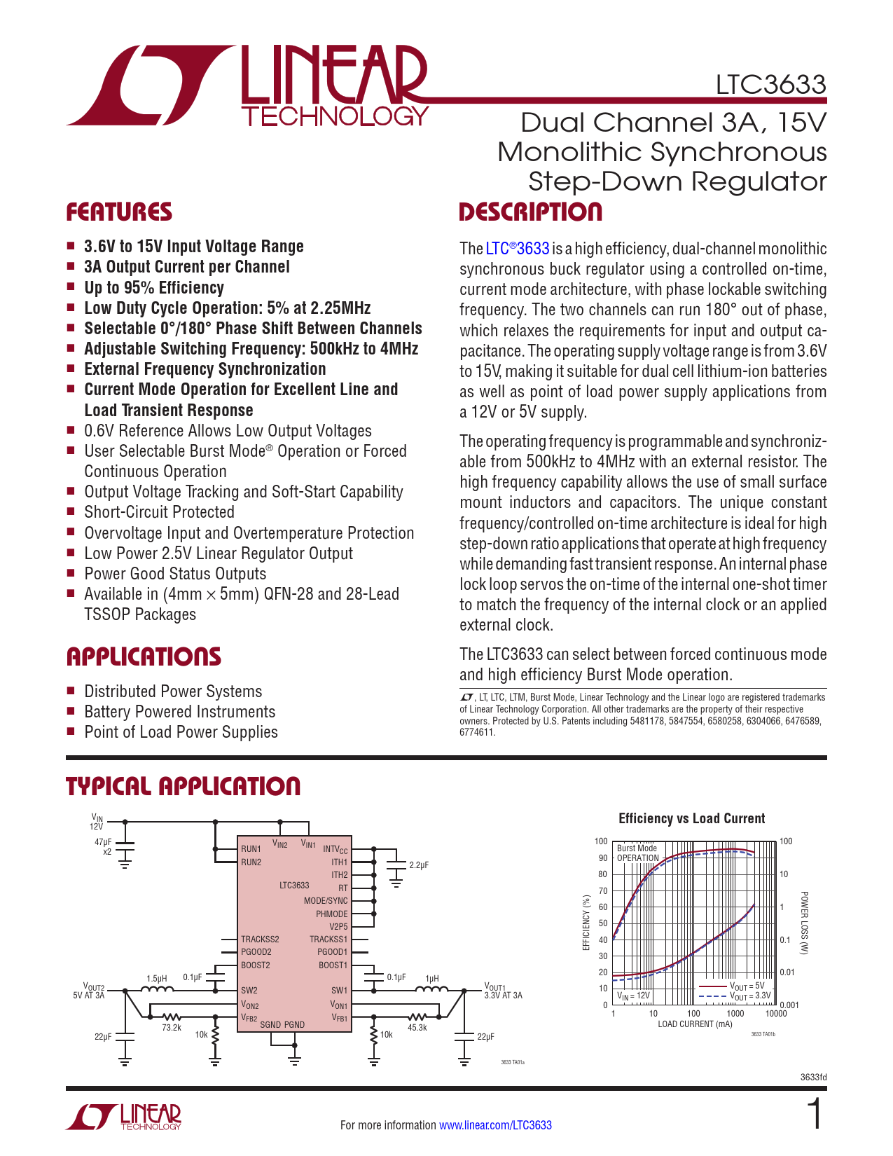 LTC3633 Dual Channel 3A, 15V Monolithic Synchronous Step-Down Regulator FEATURESDESCRIPTION n 3.6V to 15V Input Voltage Range The LTC®3633 is a high efficiency, dual-channel monolithic n 3A Output Current per Channel synchronous buck regulator using a controlled on-time, n Up to 95% Efficiency current mode architecture, with phase lockable switching n Low Duty Cycle Operation: 5% at 2.25MHz frequency. The two channels can run 180° out of phase, n Selectable 0°/180° Phase Shift Between Channels which relaxes the requirements for input and output ca- n Adjustable Switching Frequency: 500kHz to 4MHz pacitance. The operating supply voltage range is from 3.6V n External Frequency Synchronization to 15V, making it suitable for dual cell lithium-ion batteries n Current Mode Operation for Excellent Line and as well as point of load power supply applications from Load Transient Response a 12V or 5V supply. n 0.6V Reference Allows Low Output Voltages The operating frequency is programmable and synchroniz- n User Selectable Burst Mode® Operation or Forced able from 500kHz to 4MHz with an external resistor. The Continuous Operation high frequency capability allows the use of small surface n Output Voltage Tracking and Soft-Start Capability mount inductors and capacitors. The unique constant n Short-Circuit Protected frequency/controlled on-time architecture is ideal for high n Overvoltage Input and Overtemperature Protection step-down ratio applications that operate at high frequency n Low Power 2.5V Linear Regulator Output while demanding fast transient response. An internal phase n Power Good Status Outputs lock loop servos the on-time of the internal one-shot timer n Available in (4mm × 5mm) QFN-28 and 28-Lead to match the frequency of the internal clock or an applied TSSOP Packages external clock. The LTC3633 can select between forced continuous mode APPLICATIONS and high efficiency Burst Mode operation. n Distributed Power Systems L, LT, LTC, LTM, Burst Mode, Linear Technology and the Linear logo are registered trademarks n of Linear Technology Corporation. All other trademarks are the property of their respective Battery Powered Instruments owners. Protected by U.S. Patents including 5481178, 5847554, 6580258, 6304066, 6476589, n Point of Load Power Supplies 6774611. TYPICAL APPLICATION VIN Efficiency vs Load Current 12V 47µF V V 100 100 RUN1 IN2 IN1 INTV Burst Mode x2 CC 90 OPERATION RUN2 ITH1 2.2µF ITH2 80 10 LTC3633 RT POWER LOSS (W) 70 MODE/SYNC 60 1 PHMODE 50 V2P5 TRACKSS2 TRACKSS1 40 0.1 EFFICIENCY (%) PGOOD2 PGOOD1 30 BOOST2 BOOST1 20 0.01 1.5µH 0.1µF 0.1µF 1µH VOUT2 SW2 SW1 VOUT1 10 VOUT = 5V 5V AT 3A 3.3V AT 3A VIN = 12V VOUT = 3.3V VON2 VON1 0 0.001 1 10 100 1000 10000 VFB2 VFB1 SGND PGND LOAD CURRENT (mA) 73.2k 45.3k 10k 10k 3633 TA01b 22µF 22µF 3633 TA01a 3633fd For more information www.linear.com/LTC3633 1 Document Outline Features Applications Description Typical Application Absolute Maximum Ratings Pin Configuration Order Information Electrical Characteristics Typical Performance Characteristics Pin Functions Block Diagram Operation Applications Information Typical Applications Package Description Revision History Typical Application Related Parts