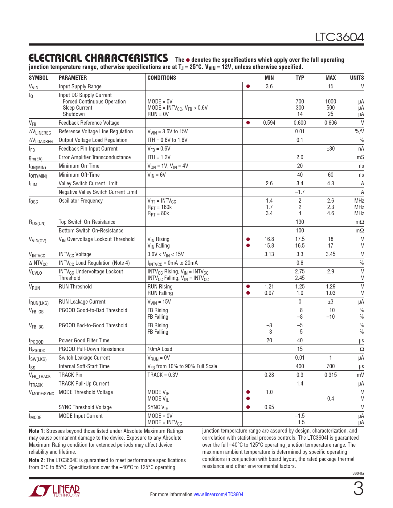 VVIN Input Supply Range l 3.6 15 V IQ Input DC Supply Current Forced Continuous Operation MODE = 0V 700 1000 µA Sleep Current MODE = INTVCC, VFB > 0.6V 300 500 µA Shutdown RUN = 0V 14 25 µA VFB Feedback Reference Voltage l 0.594 0.600 0.606 V ∆VLINEREG Reference Voltage Line Regulation VVIN = 3.6V to 15V 0.01 %/V ∆VLOADREG Output Voltage Load Regulation ITH = 0.6V to 1.6V 0.1 % IFB Feedback Pin Input Current VFB = 0.6V ±30 nA gm(EA) Error Amplifier Transconductance ITH = 1.2V 2.0 mS tON(MIN) Minimum On-Time VON = 1V, VIN = 4V 20 ns tOFF(MIN) Minimum Off-Time VIN = 6V 40 60 ns ILIM Valley Switch Current Limit 2.6 3.4 4.3 A Negative Valley Switch Current Limit –1.7 A fOSC Oscillator Frequency VRT = INTVCC 1.4 2 2.6 MHz RRT = 160k 1.7 2 2.3 MHz RRT = 80k 3.4 4 4.6 MHz RDS(ON) Top Switch On-Resistance 130 mΩ Bottom Switch On-Resistance 100 mΩ VVIN(OV) VIN Overvoltage Lockout Threshold VIN Rising l 16.8 17.5 18 V VIN Falling l 15.8 16.5 17 V VINTVCC INTVCC Voltage 3.6V < VIN < 15V 3.13 3.3 3.45 V ∆INTVCC INTVCC Load Regulation (Note 4) IINTVCC = 0mA to 20mA 0.6 % VUVLO INTVCC Undervoltage Lockout INTVCC Rising, VIN = INTVCC 2.75 2.9 V Threshold INTVCC Falling, VIN = INTVCC 2.45 V VRUN RUN Threshold RUN Rising l 1.21 1.25 1.29 V RUN Falling l 0.97 1.0 1.03 V IRUN(LKG) RUN Leakage Current VVIN = 15V 0 ±3 µA VFB_GB PGOOD Good-to-Bad Threshold FB Rising 8 10 % FB Falling –8 –10 % VFB_BG PGOOD Bad-to-Good Threshold FB Rising –3 –5 % FB Falling 3 5 % tPGOOD Power Good Filter Time 20 40 µs RPGOOD PGOOD Pull-Down Resistance 10mA Load 15 Ω ISW(LKG) Switch Leakage Current VRUN = 0V 0.01 1 µA tSS Internal Soft-Start Time VFB from 10% to 90% Full Scale 400 700 µs VFB_TRACK TRACK Pin TRACK = 0.3V 0.28 0.3 0.315 mV ITRACK TRACK Pull-Up Current 1.4 µA VMODE/SYNC MODE Threshold Voltage MODE VIH l 1.0 V MODE VIL l 0.4 V SYNC Threshold Voltage SYNC VIH l 0.95 V IMODE MODE Input Current MODE = 0V –1.5 µA MODE = INTVCC 1.5 µA