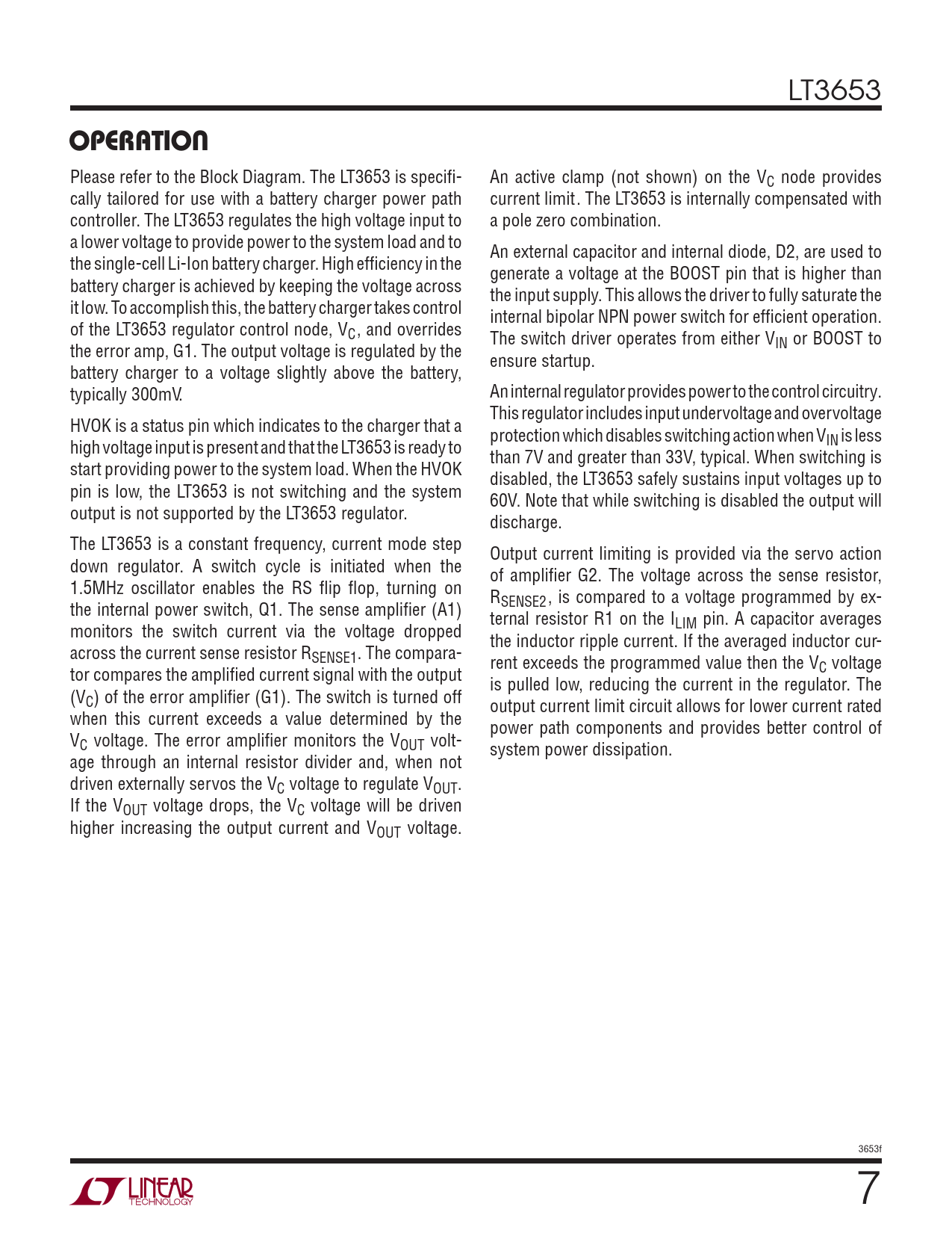 LT3653 OPERATION Please refer to the Block Diagram. The LT3653 is specifi - An active clamp (not shown) on the VC node provides cally tailored for use with a battery charger power path current limit. The LT3653 is internally compensated with controller. The LT3653 regulates the high voltage input to a pole zero combination. a lower voltage to provide power to the system load and to An external capacitor and internal diode, D2, are used to the single-cell Li-Ion battery charger. High effi ciency in the generate a voltage at the BOOST pin that is higher than battery charger is achieved by keeping the voltage across the input supply. This allows the driver to fully saturate the it low. To accomplish this, the battery charger takes control internal bipolar NPN power switch for effi cient operation. of the LT3653 regulator control node, VC, and overrides The switch driver operates from either V the error amp, G1. The output voltage is regulated by the IN or BOOST to ensure startup. battery charger to a voltage slightly above the battery, typically 300mV. An internal regulator provides power to the control circuitry. This regulator includes input undervoltage and overvoltage HVOK is a status pin which indicates to the charger that a protection which disables switching action when V high voltage input is present and that the LT3653 is ready to IN is less than 7V and greater than 33V, typical. When switching is start providing power to the system load. When the HVOK disabled, the LT3653 safely sustains input voltages up to pin is low, the LT3653 is not switching and the system 60V. Note that while switching is disabled the output will output is not supported by the LT3653 regulator. discharge. The LT3653 is a constant frequency, current mode step Output current limiting is provided via the servo action down regulator. A switch cycle is initiated when the of amplifi er G2. The voltage across the sense resistor, 1.5MHz oscillator enables the RS fl ip fl op, turning on R the internal power switch, Q1. The sense amplifi er (A1) SENSE2, is compared to a voltage programmed by ex- ternal resistor R1 on the I monitors the switch current via the voltage dropped LIM pin. A capacitor averages the inductor ripple current. If the averaged inductor cur- across the current sense resistor RSENSE1. The compara- rent exceeds the programmed value then the V tor compares the amplifi ed current signal with the output C voltage is pulled low, reducing the current in the regulator. The (VC) of the error amplifi er (G1). The switch is turned off output current limit circuit allows for lower current rated when this current exceeds a value determined by the power path components and provides better control of VC voltage. The error amplifi er monitors the VOUT volt- system power dissipation. age through an internal resistor divider and, when not driven externally servos the VC voltage to regulate VOUT. If the VOUT voltage drops, the VC voltage will be driven higher increasing the output current and VOUT voltage. 3653f 7