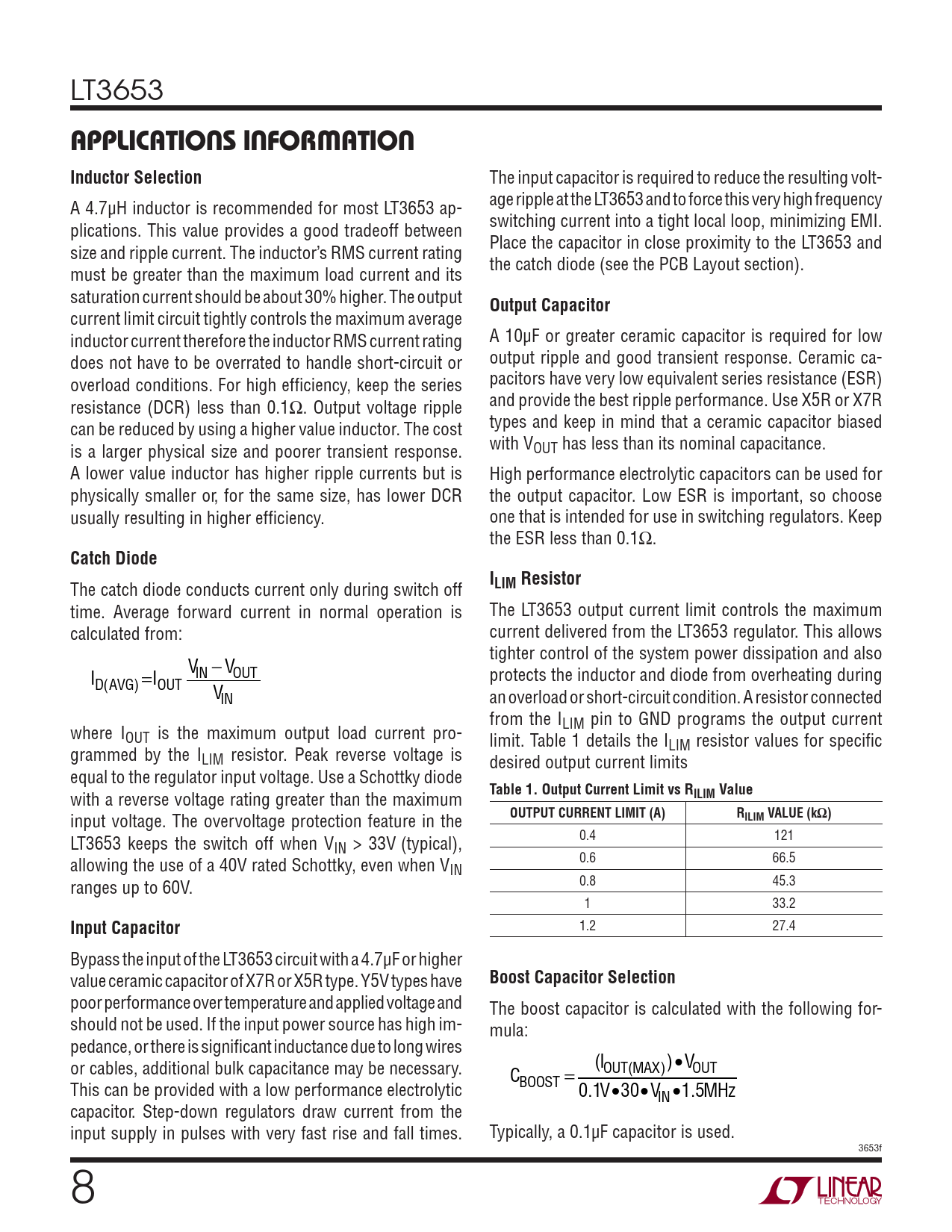 APPLICATIONS INFORMATION. Inductor Selection. Output Capacitor. Catch Diode. LIM Resistor. Table 1. Output Current Limit vs R