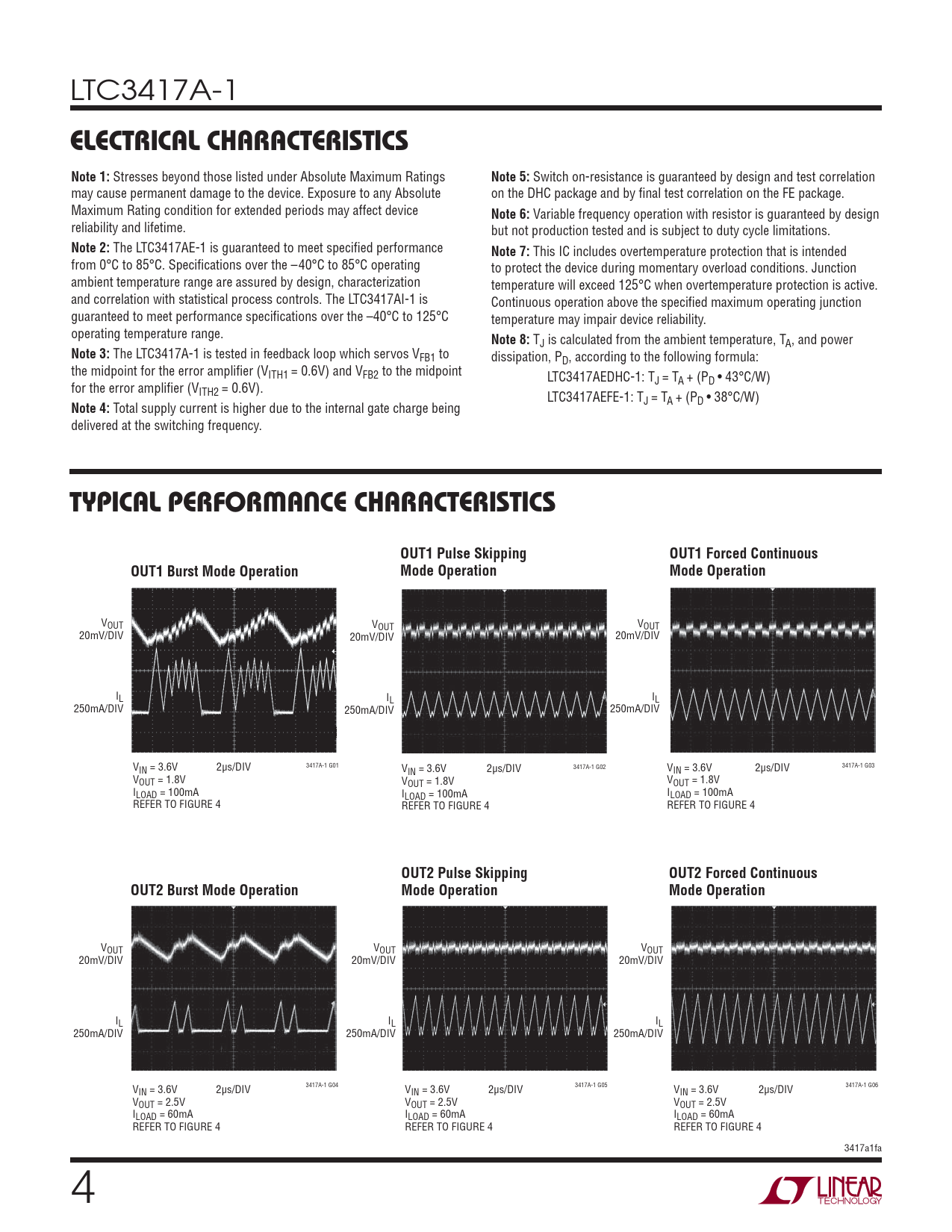The LTC3417A-1 is tested in feedback loop which servos VFB1 to dissipation, PD, according to the following formula: the midpoint for the error amplifi er (VITH1 = 0.6V) and VFB2 to the midpoint LTC3417AEDHC-1: TJ = TA + (PD • 43°C/W) for the error amplifi er (VITH2 = 0.6V). LTC3417AEFE-1: TJ = TA + (PD • 38°C/W)