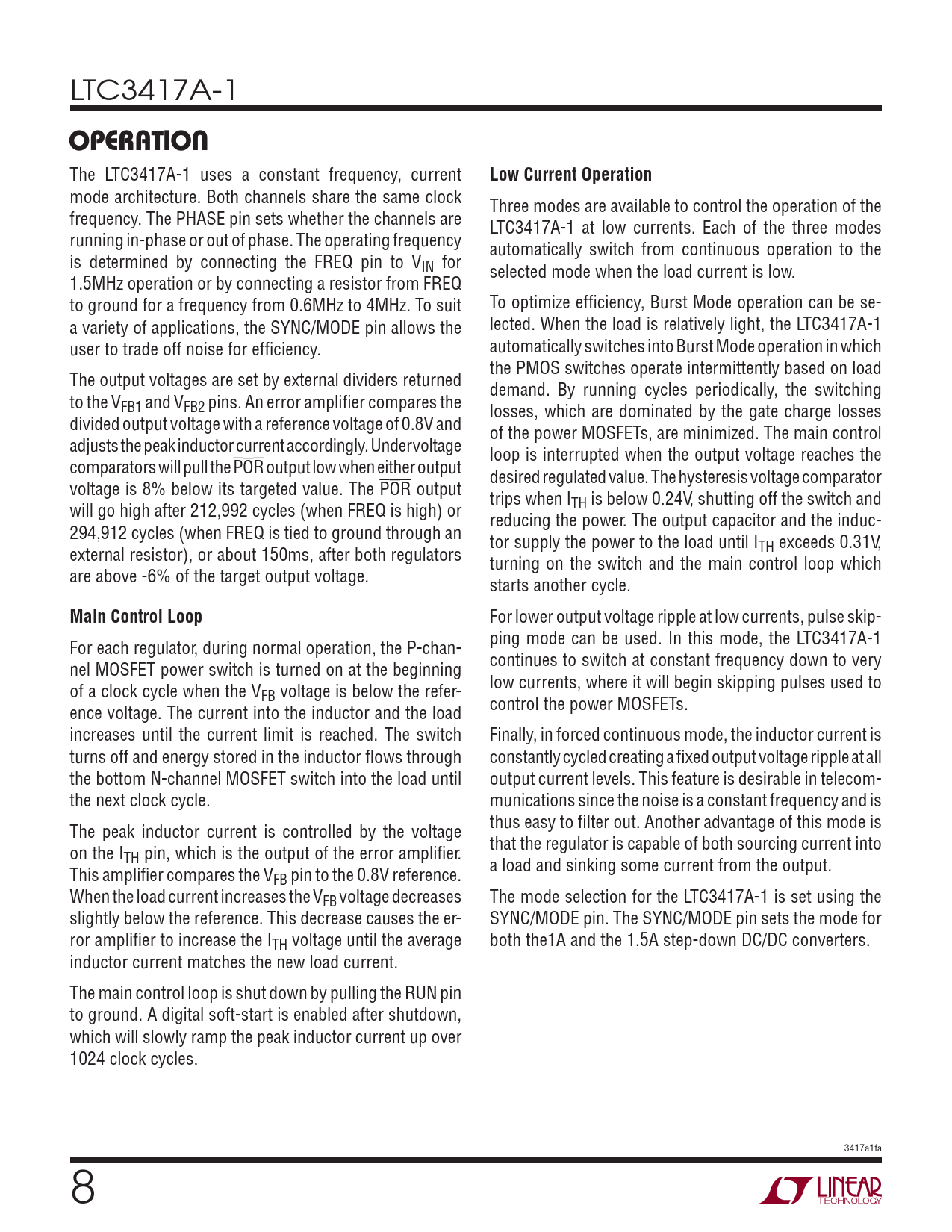mode architecture. Both channels share the same clock Three modes are available to control the operation of the frequency. The PHASE pin sets whether the channels are LTC3417A-1 at low currents. Each of the three modes running in-phase or out of phase. The operating frequency automatically switch from continuous operation to the is determined by connecting the FREQ pin to VIN for selected mode when the load current is low. 1.5MHz operation or by connecting a resistor from FREQ to ground for a frequency from 0.6MHz to 4MHz. To suit To optimize effi ciency, Burst Mode operation can be se- a variety of applications, the SYNC/MODE pin allows the lected. When the load is relatively light, the LTC3417A-1 user to trade off noise for effi ciency. automatically switches into Burst Mode operation in which the PMOS switches operate intermittently based on load The output voltages are set by external dividers returned demand. By running cycles periodically, the switching to the VFB1 and VFB2 pins. An error amplifi er compares the losses, which are dominated by the gate charge losses divided output voltage with a reference voltage of 0.8V and of the power MOSFETs, are minimized. The main control adjusts the peak inductor current accordingly. Undervoltage loop is interrupted when the output voltage reaches the comparators will pull the POR output low when either output desired regulated value. The hysteresis voltage comparator voltage is 8% below its targeted value. The POR output trips when I will go high after 212,992 cycles (when FREQ is high) or TH is below 0.24V, shutting off the switch and reducing the power. The output capacitor and the induc- 294,912 cycles (when FREQ is tied to ground through an tor supply the power to the load until I external resistor), or about 150ms, after both regulators TH exceeds 0.31V, turning on the switch and the main control loop which are above -6% of the target output voltage. starts another cycle.