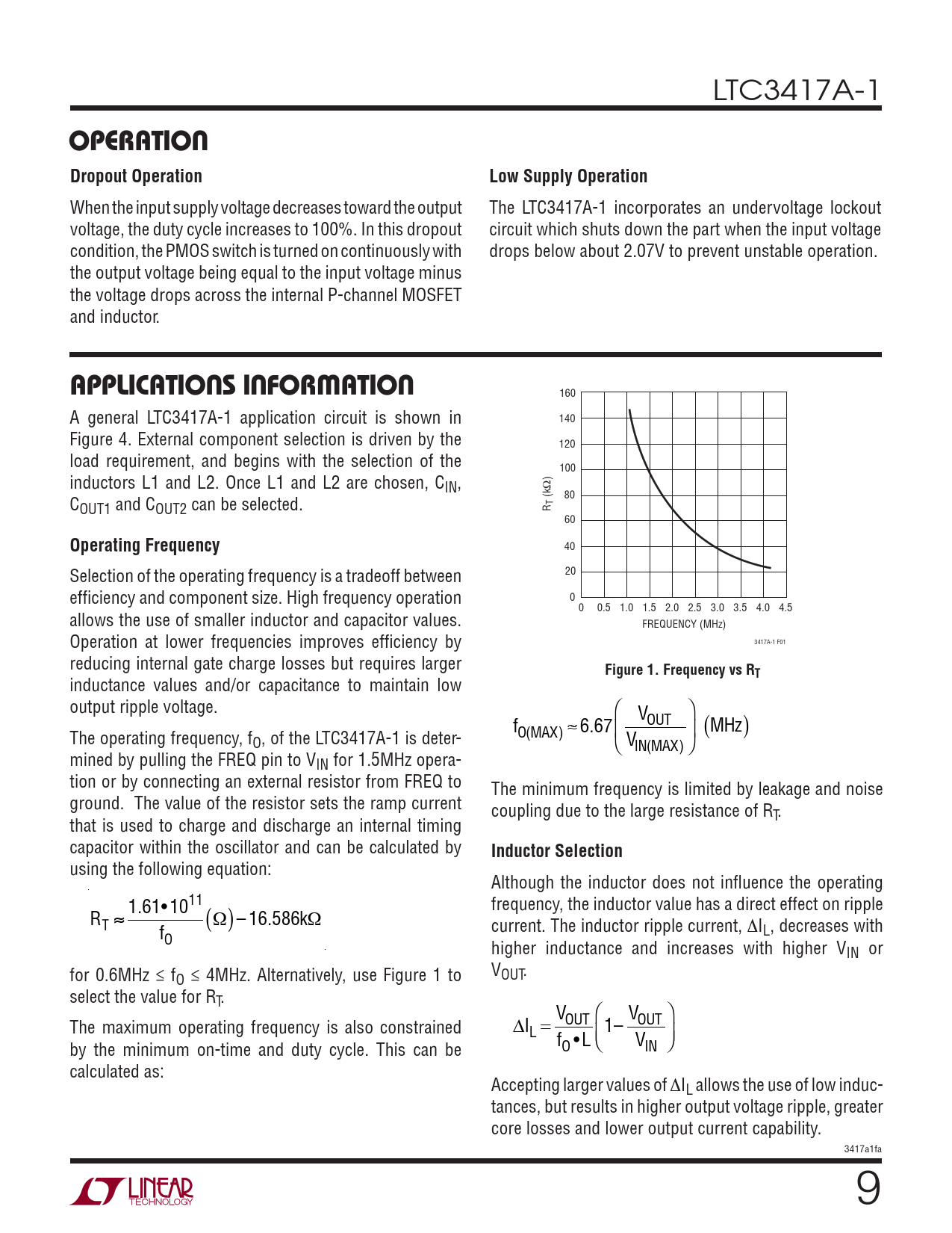 40 Selection of the operating frequency is a tradeoff between 20 effi ciency and component size. High frequency operation 0 0 0.5 1.0 1.5 2.0 2.5 3.0 3.5 4.0 4.5 allows the use of smaller inductor and capacitor values. FREQUENCY (MHz) Operation at lower frequencies improves effi ciency by 3417A-1 F01 reducing internal gate charge losses but requires larger