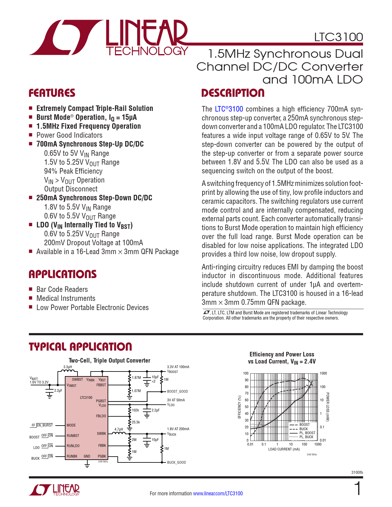 LTC3100 1.5MHz Synchronous Dual Channel DC/DC Converter and 100mA LDO FEATURESDESCRIPTION n Extremely Compact Triple-Rail Solution The LTC®3100 combines a high efficiency 700mA syn- n Burst Mode ® Operation, IQ = 15µA chronous step-up converter, a 250mA synchronous step- n 1.5MHz Fixed Frequency Operation down converter and a 100mA LDO regulator. The LTC3100 n Power Good Indicators features a wide input voltage range of 0.65V to 5V. The n 700mA Synchronous Step-Up DC/DC step-down converter can be powered by the output of 0.65V to 5V VIN Range the step-up converter or from a separate power source 1.5V to 5.25V VOUT Range between 1.8V and 5.5V. The LDO can also be used as a 94% Peak Efficiency sequencing switch on the output of the boost. VIN > VOUT Operation A switching frequency of 1.5MHz minimizes solution foot- Output Disconnect print by allowing the use of tiny, low profile inductors and n 250mA Synchronous Step-Down DC/DC ceramic capacitors. The switching regulators use current 1.8V to 5.5V VIN Range mode control and are internally compensated, reducing 0.6V to 5.5V VOUT Range external parts count. Each converter automatically transi- n LDO (VIN Internally Tied to VBST) tions to Burst Mode operation to maintain high efficiency 0.6V to 5.25V VOUT Range over the full load range. Burst Mode operation can be 200mV Dropout Voltage at 100mA disabled for low noise applications. The integrated LDO n Available in a 16-Lead 3mm × 3mm QFN Package provides a third low noise, low dropout supply. Anti-ringing circuitry reduces EMI by damping the boost APPLICATIONS inductor in discontinuous mode. Additional features include shutdown current of under 1µA and overtem- n Bar Code Readers perature shutdown. The LTC3100 is housed in a 16-lead n Medical Instruments 3mm × 3mm 0.75mm QFN package. n Low Power Portable Electronic Devices , LT, LTC, LTM and Burst Mode are registered trademarks of Linear Technology Corporation. All other trademarks are the property of their respective owners. TYPICAL APPLICATIONEfficiency and Power LossTwo-Cell, Triple Output Convertervs Load Current, VIN = 2.4V 3.3µH 3.3V AT 100mA VBOOST 100 1000 10µF VBATT SWBST V 1.87M INBK VBST 1M 1.6V TO 3.2V ×2 90 VINBST FBBST 80 100 2.2µF 1.07M BOOST_GOOD POWER LOSS (mW) 70 LTC3100 PGBST 3V AT 50mA 60 10 VLDO VLDO 50 102k 2.2µF 40 1 FBLDO EFFICIENCY (%) 25.5k 30 FF EN_BURST MODE BOOST 4.7µH 1.8V AT 200mA 20 0.1 BUCK SWBK VBUCK 10 PL, BOOST BOOST OFF ON RUNBST PL, BUCK 2M 10µF 0 0.01 OFF ON RUNLDO FBBK 0.01 0.1 1 10 100 1000 LDO 1M LOAD CURRENT (mA) 1M OFF ON RUNBK GND PGBK 3100 TA01b BUCK 3100 TA01a BUCK_GOOD 3100fb For more information www.linear.com/LTC3100 1 Document Outline Features Description Applications Typical Application Absolute Maximum Ratings Pin Configuration Order Information Electrical Characteristics Typical Performance Characteristics Pin Functions Block Diagram Operation Applications Information Typical Applications Package Description Typical Application Related Parts