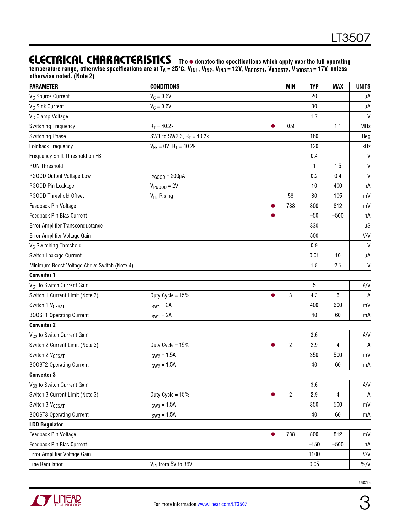 LT3507 electrical characteristicsThe l denotes the specifications which apply over the full operatingtemperature range, otherwise specifications are at TA = 25°C. VIN1, VIN2, VIN3 = 12V, VBOOST1, VBOOST2, VBOOST3 = 17V, unlessotherwise noted. (Note 2) PARAMETERCONDITIONSMINTYPMAXUNITS VC Source Current VC = 0.6V 20 µA VC Sink Current VC = 0.6V 30 µA VC Clamp Voltage 1.7 V Switching Frequency RT = 40.2k l 0.9 1.1 MHz Switching Phase SW1 to SW2,3, RT = 40.2k 180 Deg Foldback Frequency VFB = 0V, RT = 40.2k 120 kHz Frequency Shift Threshold on FB 0.4 V RUN Threshold 1 1.5 V PGOOD Output Voltage Low IPGOOD = 200µA 0.2 0.4 V PGOOD Pin Leakage VPGOOD = 2V 10 400 nA PGOOD Threshold Offset VFB Rising 58 80 105 mV Feedback Pin Voltage l 788 800 812 mV Feedback Pin Bias Current l –50 –500 nA Error Amplifier Transconductance 330 µS Error Amplifier Voltage Gain 500 V/V VC Switching Threshold 0.9 V Switch Leakage Current 0.01 10 µA Minimum Boost Voltage Above Switch (Note 4) 1.8 2.5 V Converter 1 VC1 to Switch Current Gain 5 A/V Switch 1 Current Limit (Note 3) Duty Cycle = 15% l 3 4.3 6 A Switch 1 VCESAT ISW1 = 2A 400 600 mV BOOST1 Operating Current ISW1 = 2A 40 60 mA Converter 2 VC2 to Switch Current Gain 3.6 A/V Switch 2 Current Limit (Note 3) Duty Cycle = 15% l 2 2.9 4 A Switch 2 VCESAT ISW2 = 1.5A 350 500 mV BOOST2 Operating Current ISW2 = 1.5A 40 60 mA Converter 3 VC3 to Switch Current Gain 3.6 A/V Switch 3 Current Limit (Note 3) Duty Cycle = 15% l 2 2.9 4 A Switch 3 VCESAT ISW3 = 1.5A 350 500 mV BOOST3 Operating Current ISW3 = 1.5A 40 60 mA LDO Regulator Feedback Pin Voltage l 788 800 812 mV Feedback Pin Bias Current –150 –500 nA Error Amplifier Voltage Gain 1100 V/V Line Regulation VIN from 5V to 36V 0.05 %/V 3507fb For more information www.linear.com/LT3507 3