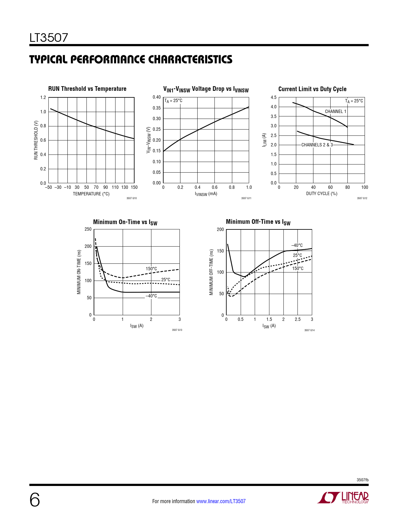 250 200 200 –40°C 150 25°C 150 150°C 150°C 100 100 25°C MINIMUM ON-TIME (ns) MINIMUM OFF-TIME (ns) 50 50 –40°C 0 0 0 1 2 3 0 0.5 1 1.5 2 2.5 3 ISW (A) ISW (A) 3507 G13 3507 G14 3507fb 6 For more information www.linear.com/LT3507