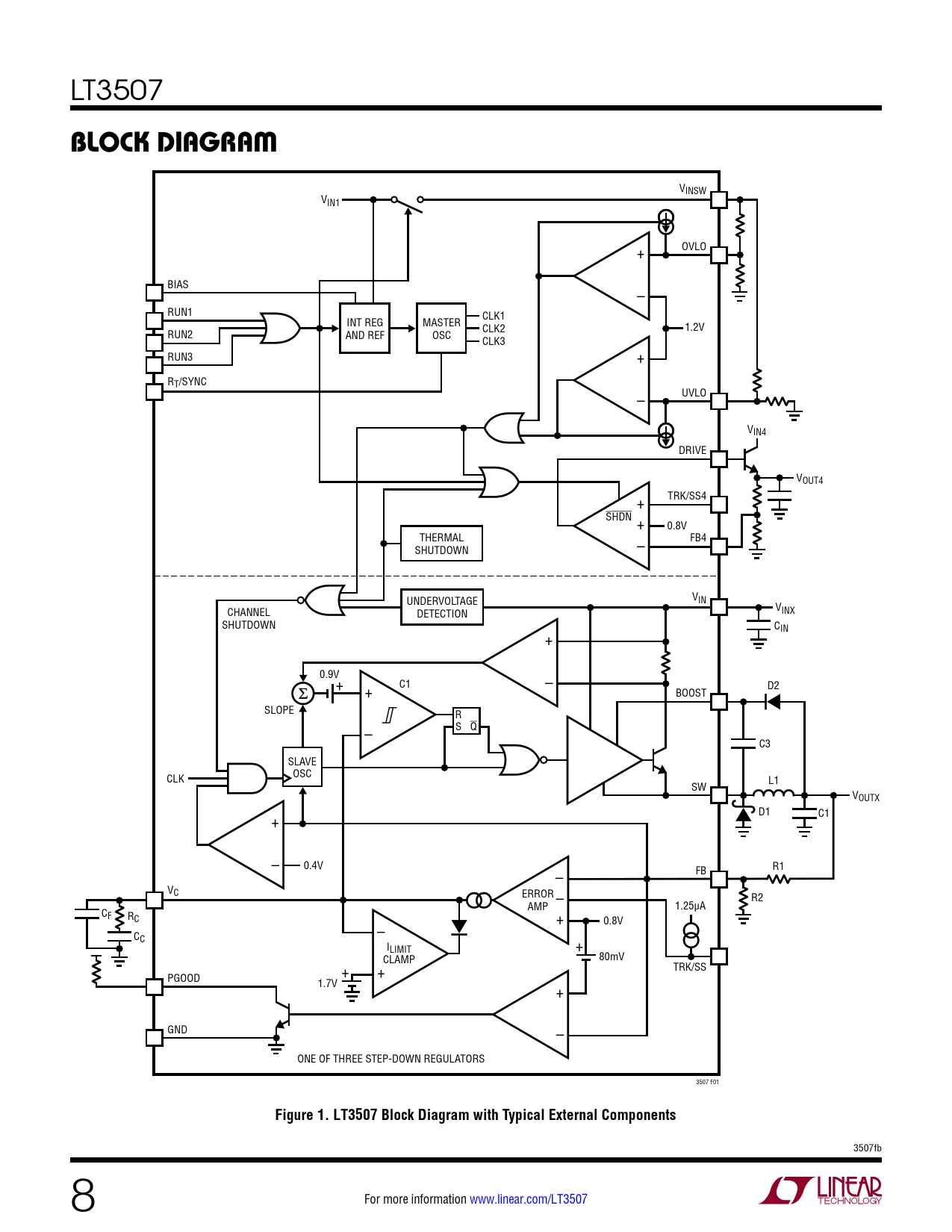 VINSW VIN1 + OVLO BIAS – RUN1 CLK1 INT REG MASTER CLK2 1.2V RUN2 AND REF OSC CLK3 RUN3 + RT/SYNC – UVLO VIN4 DRIVE VOUT4 + TRK/SS4 SHDN + 0.8V THERMAL SHUTDOWN – FB4 V UNDERVOLTAGE IN VINX CHANNEL DETECTION SHUTDOWN CIN + 0.9V + C1 – + D2 BOOST SLOPE R – S Q C3 SLAVE CLK OSC SW L1 VOUTX D1 + C1 – 0.4V R1 – FB VC ERROR – R2 AMP 1.25µA CF RC – + 0.8V CC ILIMIT + + 80mV CLAMP TRK/SS + PGOOD 1.7V + GND – ONE OF THREE STEP-DOWN REGULATORS 3507 F01