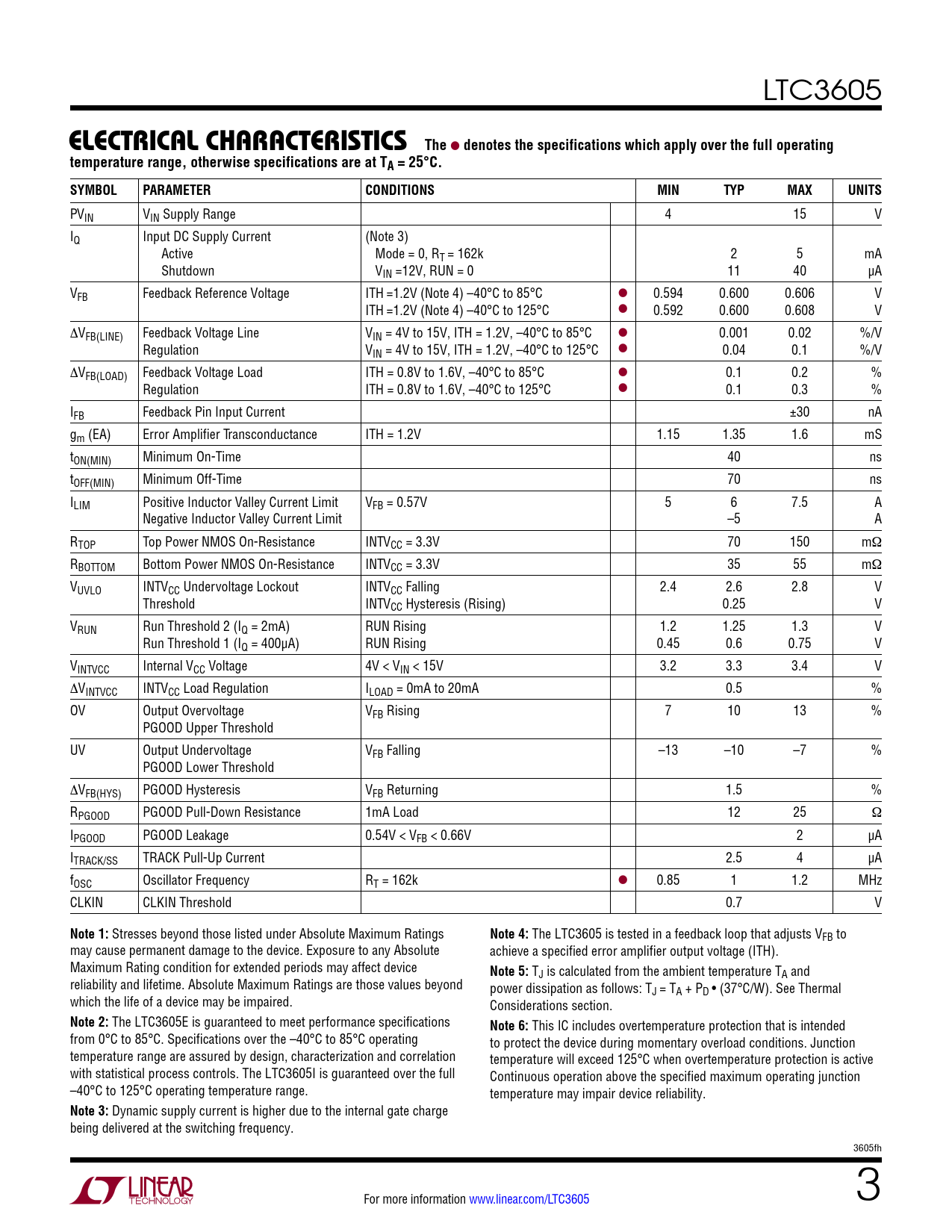 PVIN VIN Supply Range 4 15 V IQ Input DC Supply Current (Note 3) Active Mode = 0, RT = 162k 2 5 mA Shutdown VIN =12V, RUN = 0 11 40 µA VFB Feedback Reference Voltage ITH =1.2V (Note 4) –40°C to 85°C l 0.594 0.600 0.606 V ITH =1.2V (Note 4) –40°C to 125°C l 0.592 0.600 0.608 V DVFB(LINE) Feedback Voltage Line VIN = 4V to 15V, ITH = 1.2V, –40°C to 85°C l 0.001 0.02 %/V Regulation VIN = 4V to 15V, ITH = 1.2V, –40°C to 125°C l 0.04 0.1 %/V DVFB(LOAD) Feedback Voltage Load ITH = 0.8V to 1.6V, –40°C to 85°C l 0.1 0.2 % Regulation ITH = 0.8V to 1.6V, –40°C to 125°C l 0.1 0.3 % IFB Feedback Pin Input Current ±30 nA gm (EA) Error Amplifier Transconductance ITH = 1.2V 1.15 1.35 1.6 mS tON(MIN) Minimum On-Time 40 ns tOFF(MIN) Minimum Off-Time 70 ns ILIM Positive Inductor Valley Current Limit VFB = 0.57V 5 6 7.5 A Negative Inductor Valley Current Limit –5 A RTOP Top Power NMOS On-Resistance INTVCC = 3.3V 70 150 mW RBOTTOM Bottom Power NMOS On-Resistance INTVCC = 3.3V 35 55 mW VUVLO INTVCC Undervoltage Lockout INTVCC Falling 2.4 2.6 2.8 V Threshold INTVCC Hysteresis (Rising) 0.25 V VRUN Run Threshold 2 (IQ = 2mA) RUN Rising 1.2 1.25 1.3 V Run Threshold 1 (IQ = 400µA) RUN Rising 0.45 0.6 0.75 V VINTVCC Internal VCC Voltage 4V < VIN < 15V 3.2 3.3 3.4 V DVINTVCC INTVCC Load Regulation ILOAD = 0mA to 20mA 0.5 % OV Output Overvoltage VFB Rising 7 10 13 % PGOOD Upper Threshold UV Output Undervoltage VFB Falling –13 –10 –7 % PGOOD Lower Threshold DVFB(HYS) PGOOD Hysteresis VFB Returning 1.5 % RPGOOD PGOOD Pull-Down Resistance 1mA Load 12 25 W IPGOOD PGOOD Leakage 0.54V < VFB < 0.66V 2 µA ITRACK/SS TRACK Pull-Up Current 2.5 4 µA fOSC Oscillator Frequency RT = 162k l 0.85 1 1.2 MHz CLKIN CLKIN Threshold 0.7 V
