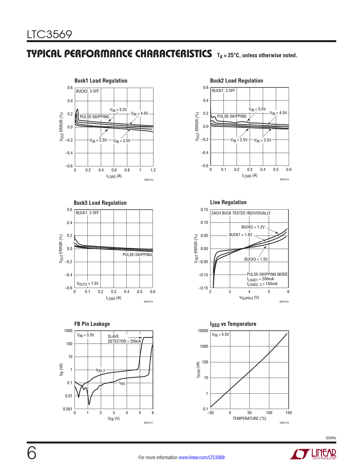 0.6 0.15 BUCK1, 2 OFF EACH BUCK TESTED INDIVIDUALLY 0.4 0.10 BUCK2 = 1.2V 0.2 0.05 BUCK1 = 1.8V 0.0 0.00 ERROR (%) ERROR (%) PULSE-SKIPPING V OUT –0.2 V OUT BUCK3 = 1.5V –0.05 –0.4 –0.10 PULSE-SKIPPING MODE ILOAD1 = 200mA VOUT3 = 1.5V ILOAD2, 3 = 150mA –0.6 –0.15 0 0.1 0.2 0.3 0.4 0.5 0.6 2 3 4 5 6 ILOAD (A) VSUPPLY (V) 3569 G15 3569 G16