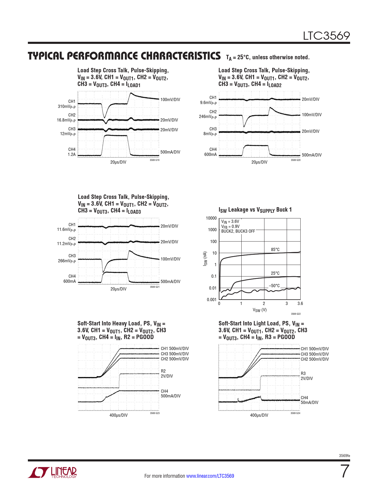 10000 V CH1 IN = 3.6V 20mV/DIV V 11.6mV FB = 0.9V P-P 1000 BUCK2, BUCK3 OFF CH2 11.2mV 20mV/DIV 100 P-P 85°C 10 CH3 266mV 100mV/DIV (nA) P-P I SW 1 25°C CH4 0.1 600mA 500mA/DIV –50°C 20µs/DIV 3569 G21 0.01 0.001 0 1 2 3 3.6 VSW (V) 3569 G22