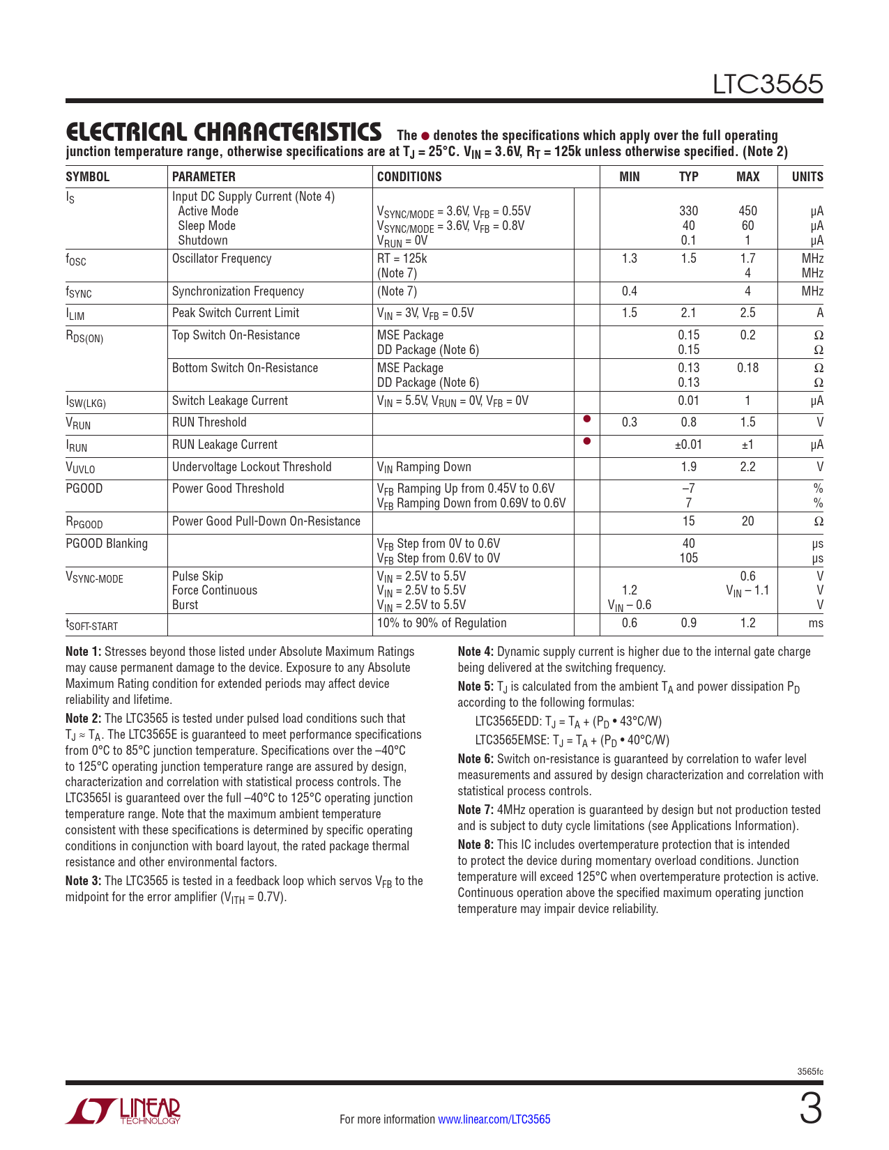 LTC3565 ELECTRICAL CHARACTERISTICSThe l denotes the specifications which apply over the full operatingjunction temperature range, otherwise specifications are at TJ = 25°C. VIN = 3.6V, RT = 125k unless otherwise specified. (Note 2) SYMBOLPARAMETERCONDITIONSMINTYPMAXUNITS IS Input DC Supply Current (Note 4) Active Mode VSYNC/MODE = 3.6V, VFB = 0.55V 330 450 µA Sleep Mode VSYNC/MODE = 3.6V, VFB = 0.8V 40 60 µA Shutdown VRUN = 0V 0.1 1 µA fOSC Oscillator Frequency RT = 125k 1.3 1.5 1.7 MHz (Note 7) 4 MHz fSYNC Synchronization Frequency (Note 7) 0.4 4 MHz ILIM Peak Switch Current Limit VIN = 3V, VFB = 0.5V 1.5 2.1 2.5 A RDS(ON) Top Switch On-Resistance MSE Package 0.15 0.2 Ω DD Package (Note 6) 0.15 Ω Bottom Switch On-Resistance MSE Package 0.13 0.18 Ω DD Package (Note 6) 0.13 Ω ISW(LKG) Switch Leakage Current VIN = 5.5V, VRUN = 0V, VFB = 0V 0.01 1 µA VRUN RUN Threshold l 0.3 0.8 1.5 V IRUN RUN Leakage Current l ±0.01 ±1 µA VUVLO Undervoltage Lockout Threshold VIN Ramping Down 1.9 2.2 V PGOOD Power Good Threshold VFB Ramping Up from 0.45V to 0.6V –7 % VFB Ramping Down from 0.69V to 0.6V 7 % RPGOOD Power Good Pull-Down On-Resistance 15 20 Ω PGOOD Blanking VFB Step from 0V to 0.6V 40 µs VFB Step from 0.6V to 0V 105 µs VSYNC-MODE Pulse Skip VIN = 2.5V to 5.5V 0.6 V Force Continuous VIN = 2.5V to 5.5V 1.2 VIN – 1.1 V Burst VIN = 2.5V to 5.5V VIN – 0.6 V tSOFT-START 10% to 90% of Regulation 0.6 0.9 1.2 ms Note 1: Stresses beyond those listed under Absolute Maximum Ratings Note 4: Dynamic supply current is higher due to the internal gate charge may cause permanent damage to the device. Exposure to any Absolute being delivered at the switching frequency. Maximum Rating condition for extended periods may affect device Note 5: TJ is calculated from the ambient TA and power dissipation PD reliability and lifetime. according to the following formulas: Note 2: The LTC3565 is tested under pulsed load conditions such that LTC3565EDD: TJ = T A + (PD • 43°C/W) TJ ≈ TA. The LTC3565E is guaranteed to meet performance specifications LTC3565EMSE: T from 0°C to 85°C junction temperature. Specifications over the –40°C J = T A + (PD • 40°C/W) to 125°C operating junction temperature range are assured by design, Note 6: Switch on-resistance is guaranteed by correlation to wafer level characterization and correlation with statistical process controls. The measurements and assured by design characterization and correlation with LTC3565I is guaranteed over the full –40°C to 125°C operating junction statistical process controls. temperature range. Note that the maximum ambient temperature Note 7: 4MHz operation is guaranteed by design but not production tested consistent with these specifications is determined by specific operating and is subject to duty cycle limitations (see Applications Information). conditions in conjunction with board layout, the rated package thermal Note 8: This IC includes overtemperature protection that is intended resistance and other environmental factors. to protect the device during momentary overload conditions. Junction Note 3: The LTC3565 is tested in a feedback loop which servos V temperature will exceed 125°C when overtemperature protection is active. FB to the midpoint for the error amplifier (V Continuous operation above the specified maximum operating junction ITH = 0.7V). temperature may impair device reliability. 3565fc For more information www.linear.com/LTC3565 3 Document Outline Features Applications Description Typical Application Absolute Maximum Ratings Pin Configuration Order Information Electrical Characteristics Typical Performance Characteristics Pin Functions Block Diagram Operation Applications Information Typical Application Package Description Revision History Typical Application Related Parts