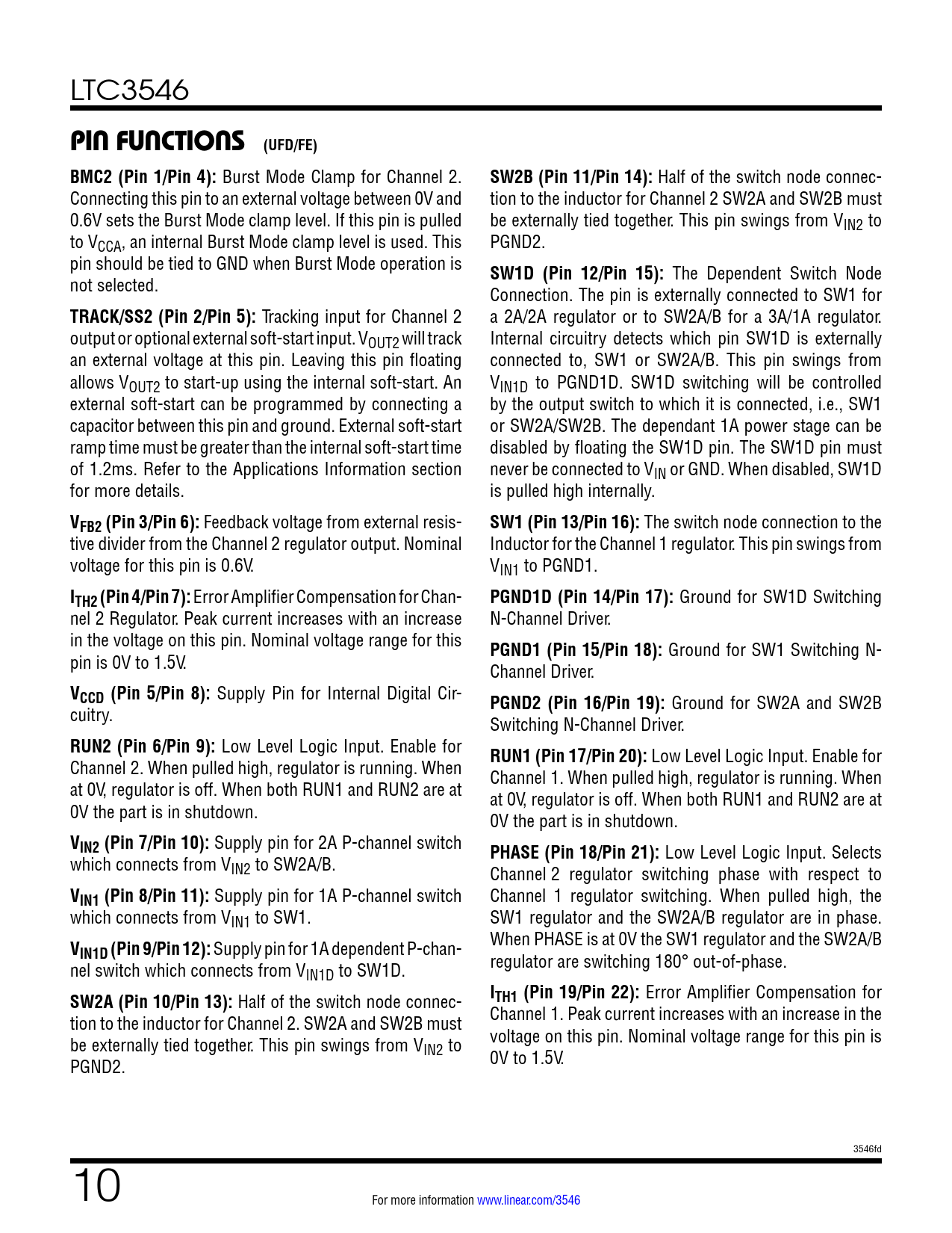 PIN FUNCTIONS (UFD/FE) BMC2 (Pin 1/Pin 4):. SW2B (Pin 11/Pin 14):. SW1D (Pin 12/Pin 15):. TRACK/SS2 (Pin 2/Pin 5):