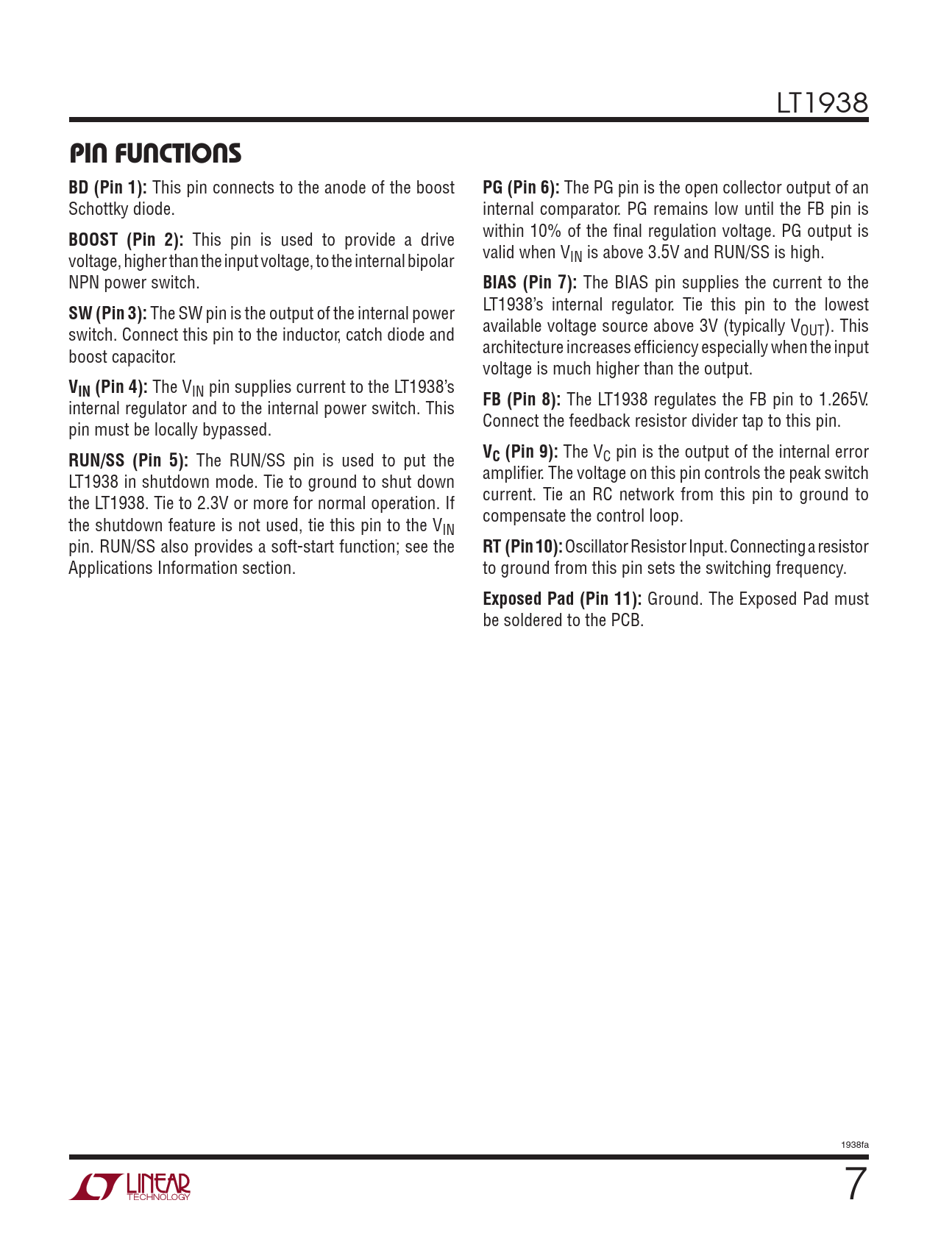 Ground. The Exposed Pad must be soldered to the PCB. 1938fa 7 Document Outline FEATURES DESCRIPTION APPLICATIONS TYPICAL APPLICATION ABSOLUTE MAXIMUM RATINGS PIN CONFIGURATION ORDER INFORMATION ELECTRICAL ChARACTERISTICS TYPICAL PERFORMANCE ChARACTERISTICS PIN FUNCTIONS BLOCK DIAGRAM OPERATION APPLICATIONS INFORMATION TYPICAL APPLICATIONS PACKAGE DESCRIPTION TYPICAL APPLICATION RELATED PARTS