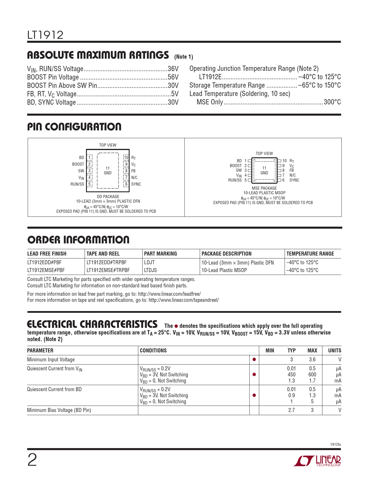 LT1912 ABSOLUTE MAXIMUM RATINGS (Note 1) VIN, RUN/SS Voltage ...36V Operating Junction Temperature Range (Note 2) BOOST Pin Voltage ...56V LT1912E .. –40°C to 125°C BOOST Pin Above SW Pin ...30V Storage Temperature Range .. –65°C to 150°C FB, RT, VC Voltage ...5V Lead Temperature (Soldering, 10 sec) BD, SYNC Voltage ...30V MSE Only ..300°C PIN CONFIGURATION TOP VIEW TOP VIEW BD 1 10 RT BD 1 10 R BOOST 2 9 V T C BOOST 2 9 V 11 C 11 SW 3 8 SW 3 8 FB GND FB GND V VIN 4 7 N/C IN 4 7 N/C RUN/SS 5 6 SYNC RUN/SS 5 6 SYNC MSE PACKAGE 10-LEAD PLASTIC MSOP DD PACKAGE 10-LEAD (3mm × 3mm) PLASTIC DFN JA = 45°C/W, JC = 10°C/W EXPOSED PAD (PIN 11) IS GND, MUST BE SOLDERED TO PCB JA = 45°C/W, JC = 10°C/W EXPOSED PAD (PIN 11) IS GND, MUST BE SOLDERED TO PCB ORDER INFORMATION LEAD FREE FINISHTAPE AND REELPART MARKINGPACKAGE DESCRIPTIONTEMPERATURE RANGE LT1912EDD#PBF LT1912EDD#TRPBF LDJT 10-Lead (3mm × 3mm) Plastic DFN –40°C to 125°C LT1912EMSE#PBF LT1912EMSE#TRPBF LTDJS 10-Lead Plastic MSOP –40°C to 125°C Consult LTC Marketing for parts specified with wider operating temperature ranges. Consult LTC Marketing for information on non-standard lead based finish parts. For more information on lead free part marking, go to: http://www.linear.com/leadfree/ For more information on tape and reel specifications, go to: http://www.linear.com/tapeandreel/ ELECTRICAL CHARACTERISTICSThe l denotes the specifications which apply over the full operatingtemperature range, otherwise specifications are at TA = 25°C. VIN = 10V, VRUN/SS = 10V, VBOOST = 15V, VBD = 3.3V unless otherwisenoted. (Note 2)PARAMETERCONDITIONSMINTYPMAXUNITS Minimum Input Voltage l 3 3.6 V Quiescent Current from VIN VRUN/SS = 0.2V 0.01 0.5 µA VBD = 3V, Not Switching l 450 600 µA VBD = 0, Not Switching 1.3 1.7 mA Quiescent Current from BD VRUN/SS = 0.2V 0.01 0.5 µA VBD = 3V, Not Switching l 0.9 1.3 mA VBD = 0, Not Switching 1 5 µA Minimum Bias Voltage (BD Pin) 2.7 3 V 1912fa 2 Document Outline Features Applications Description Typical Application Absolute Maximum Ratings Pin Configuration Order Information Electrical Characteristics Typical Performance Characteristics Pin Functions Block Diagram Operation Applications Information Typical Applications Package Description Revision History Typical Application Related Parts
