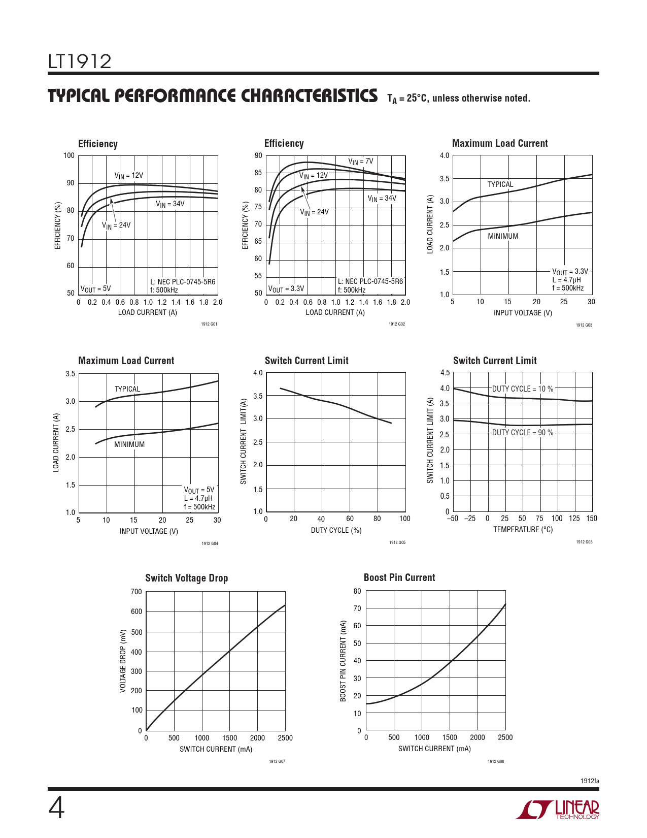 3.5 4.0 4.5 TYPICAL 4.0 DUTY CYCLE = 10 % 3.5 3.0 3.5 3.0 3.0 2.5 2.5 DUTY CYCLE = 90 % 2.5 MINIMUM 2.0 2.0 2.0 LOAD CURRENT (A) 1.5 SWITCH CURRENT LIMIT(A) 1.5 SWITCH CURRENT LIMIT (A) 1.0 VOUT = 5V 1.5 L = 4.7µH 0.5 f = 500kHz 1.0 1.0 0 5 10 15 20 25 30 0 20 40 60 80 100 –50 –25 0 25 50 75 100 125 150 INPUT VOLTAGE (V) DUTY CYCLE (%) TEMPERATURE (°C) 1912 G05 1912 G04 1912 G06