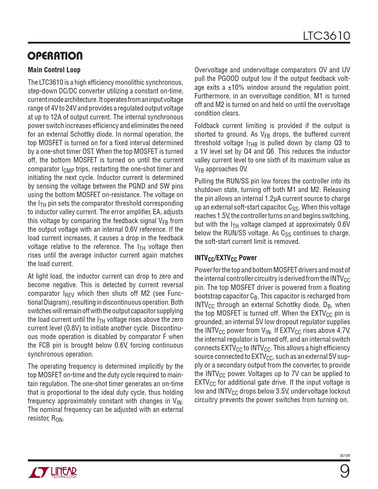 Overvoltage and undervoltage comparators OV and UV The LTC3610 is a high efficiency monolithic synchronous, pull the PGOOD output low if the output feedback volt- step-down DC/DC converter utilizing a constant on-time, age exits a ±10% window around the regulation point. current mode architecture. It operates from an input voltage Furthermore, in an overvoltage condition, M1 is turned range of 4V to 24V and provides a regulated output voltage off and M2 is turned on and held on until the overvoltage at up to 12A of output current. The internal synchronous condition clears. power switch increases efficiency and eliminates the need Foldback current limiting is provided if the output is for an external Schottky diode. In normal operation, the shorted to ground. As VFB drops, the buffered current top MOSFET is turned on for a fixed interval determined threshold voltage ITHB is pulled down by clamp Q3 to by a one-shot timer OST. When the top MOSFET is turned a 1V level set by Q4 and Q6. This reduces the inductor off, the bottom MOSFET is turned on until the current valley current level to one sixth of its maximum value as comparator ICMP trips, restarting the one-shot timer and VFB approaches 0V. initiating the next cycle. Inductor current is determined Pulling the RUN/SS pin low forces the controller into its by sensing the voltage between the PGND and SW pins shutdown state, turning off both M1 and M2. Releasing using the bottom MOSFET on-resistance. The voltage on the pin allows an internal 1.2µA current source to charge the ITH pin sets the comparator threshold corresponding up an external soft-start capacitor, C to inductor valley current. The error amplifier, EA, adjusts SS. When this voltage reaches 1.5V, the controller turns on and begins switching, this voltage by comparing the feedback signal VFB from but with the I the output voltage with an internal 0.6V reference. If the TH voltage clamped at approximately 0.6V below the RUN/SS voltage. As C load current increases, it causes a drop in the feedback SS continues to charge, the soft-start current limit is removed. voltage relative to the reference. The ITH voltage then rises until the average inductor current again matches