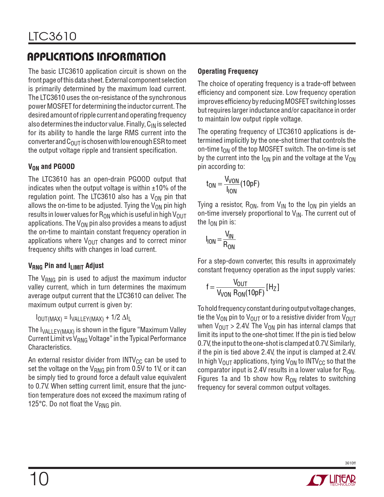 front page of this data sheet. External component selection The choice of operating frequency is a trade-off between is primarily determined by the maximum load current. efficiency and component size. Low frequency operation The LTC3610 uses the on-resistance of the synchronous improves efficiency by reducing MOSFET switching losses power MOSFET for determining the inductor current. The but requires larger inductance and/or capacitance in order desired amount of ripple current and operating frequency to maintain low output ripple voltage. also determines the inductor value. Finally, CIN is selected for its ability to handle the large RMS current into the The operating frequency of LTC3610 applications is de- converter and COUT is chosen with low enough ESR to meet termined implicitly by the one-shot timer that controls the the output voltage ripple and transient specification. on-time tON of the top MOSFET switch. The on-time is set by the current into the ION pin and the voltage at the VON