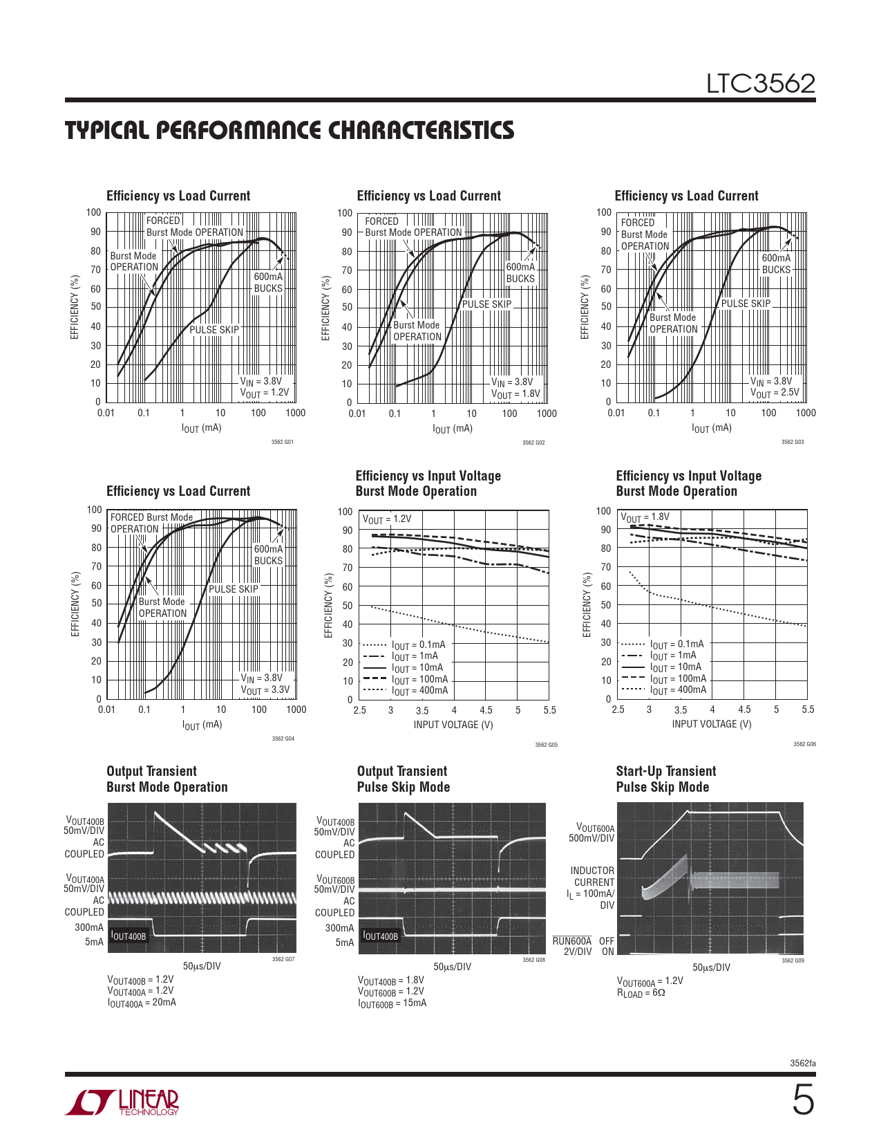 100 100 100 FORCED Burst Mode V V OUT = 1.2V OUT = 1.8V 90 OPERATION 90 90 80 600mA 80 80 BUCKS 70 70 70 60 PULSE SKIP 60 60 50 Burst Mode 50 50 OPERATION 40 40 40 EFFICIENCY (%) EFFICIENCY (%) EFFICIENCY (%) 30 30 IOUT = 0.1mA 30 IOUT = 0.1mA I I 20 20 OUT = 1mA 20 OUT = 1mA IOUT = 10mA IOUT = 10mA 10 VIN = 3.8V 10 IOUT = 100mA 10 IOUT = 100mA VOUT = 3.3V IOUT = 400mA IOUT = 400mA 0 0 0 0.01 0.1 1 10 100 1000 2.5 3 3.5 4 4.5 5 5.5 2.5 3 3.5 4 4.5 5 5.5 IOUT (mA) INPUT VOLTAGE (V) INPUT VOLTAGE (V) 3562 G04 3562 G05 3562 G06