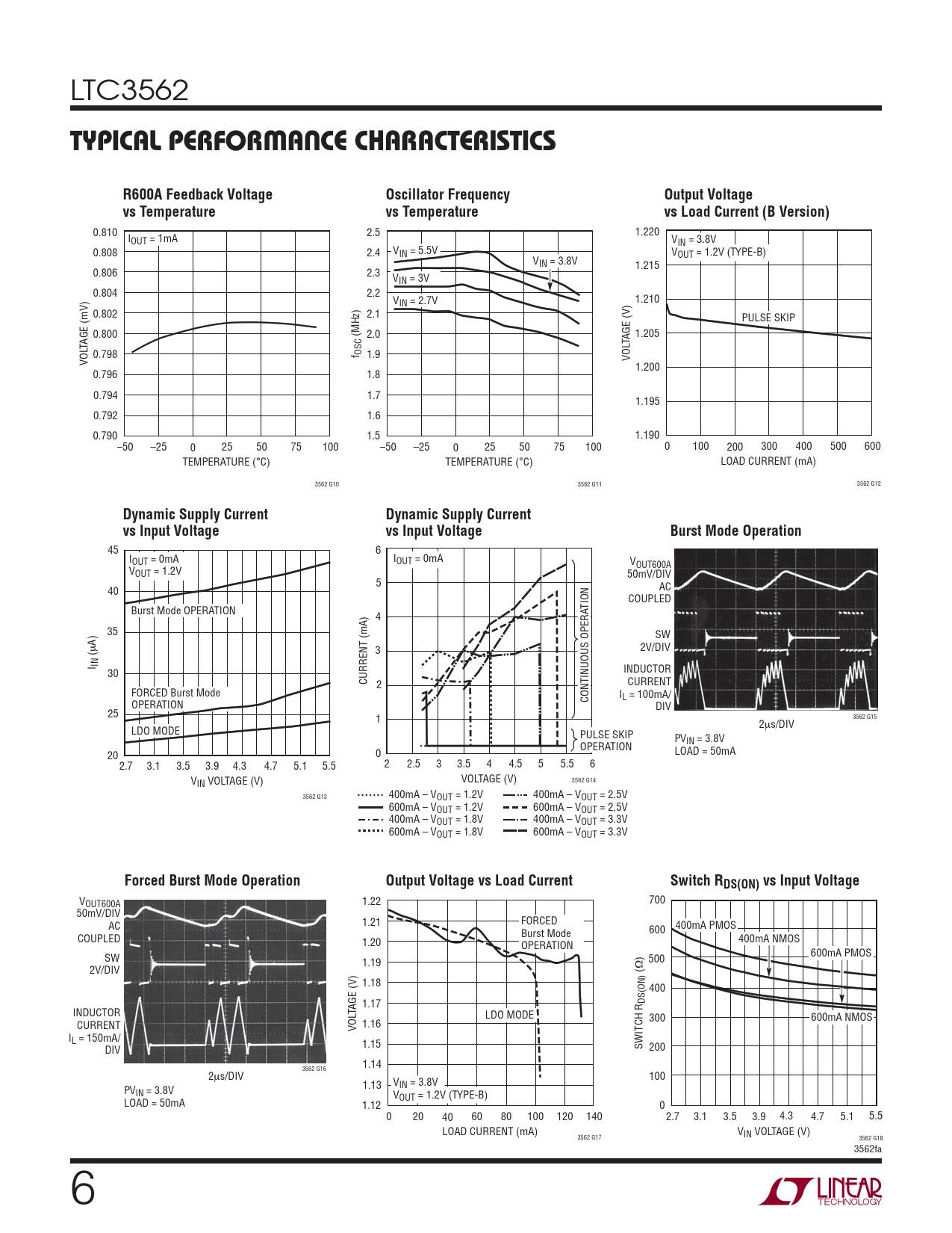 VOUT600A 1.22 700 50mV/DIV AC 1.21 FORCED 600 400mA PMOS COUPLED Burst Mode 1.20 400mA NMOS OPERATION SW ) 600mA PMOS 1.19 500 2V/DIV Ω ( 1.18 400 1.17 DS(ON) INDUCTOR TAGE (V) LDO MODE 300 600mA NMOS CURRENT VOL 1.16 IL = 150mA/ 1.15 DIV SWITCH R 200 1.14 3562 G16 2μs/DIV 100 1.13 VIN = 3.8V PVIN = 3.8V VOUT = 1.2V (TYPE-B) LOAD = 50mA 1.12 0 0 20 40 60 80 100 120 140 2.7 3.1 3.5 3.9 4.3 4.7 5.1 5.5 LOAD CURRENT (mA) V 3562 G17 IN VOLTAGE (V) 3562 G18 3562fa 6