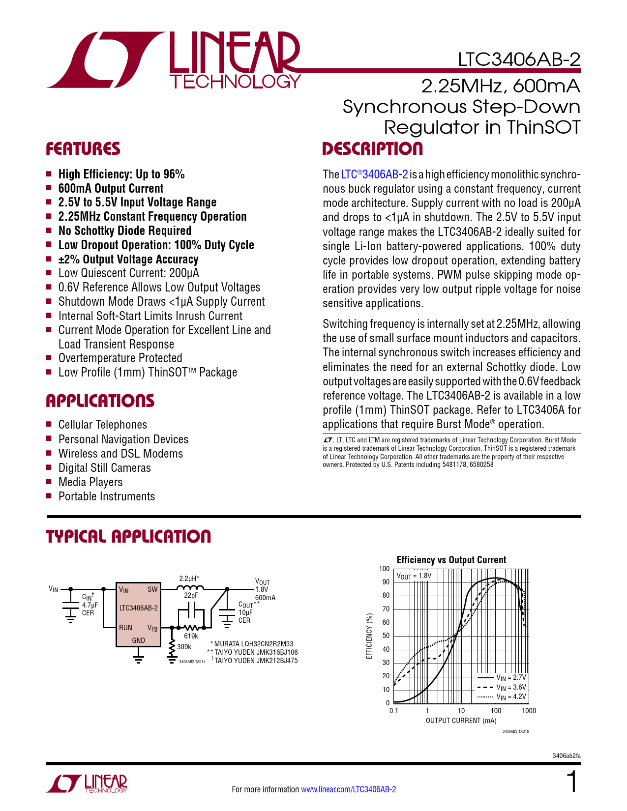 reference voltage. The LTC3406AB-2 is available in a low profile (1mm) ThinSOT package. Refer to LTC3406A for n Cellular Telephones applications that require Burst Mode® operation. n L Personal Navigation Devices , LT, LTC and LTM are registered trademarks of Linear Technology Corporation. Burst Mode is a registered trademark of Linear Technology Corporation. ThinSOT is a registered trademark n Wireless and DSL Modems of Linear Technology Corporation. All other trademarks are the property of their respective n owners. Protected by U.S. Patents including 5481178, 6580258 Digital Still Cameras n Media Players n Portable Instruments