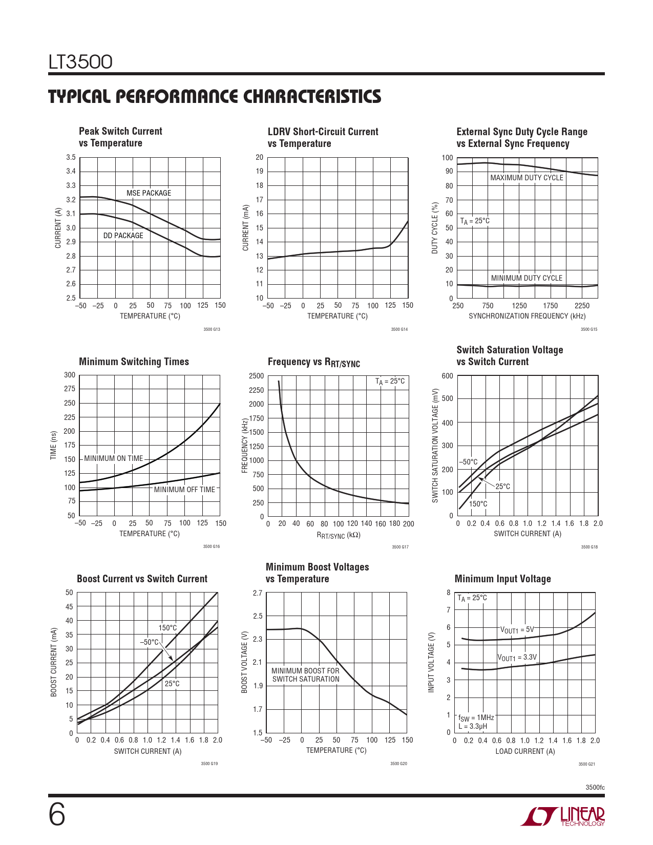 300 2500 600 TA = 25°C 275 2250 500 250 2000 225 1750 400 200 1500 175 1250 300 TIME (ns) 150 MINIMUM ON TIME 1000 –50°C 200 125 FREQUENCY (kHz) 750 100 MINIMUM OFF TIME 500 25°C 100 75 250 SWITCH SATURATION VOLTAGE (mV) 150°C 50 0 0 –50 –25 0 25 50 75 100 125 150 0 20 40 60 80 100 120 140 160 180 200 0 0.2 0.4 0.6 0.8 1.0 1.2 1.4 1.6 1.8 2.0 TEMPERATURE (°C) R SWITCH CURRENT (A) RT/SYNC (kΩ) 3500 G16 3500 G17 3500 G18
