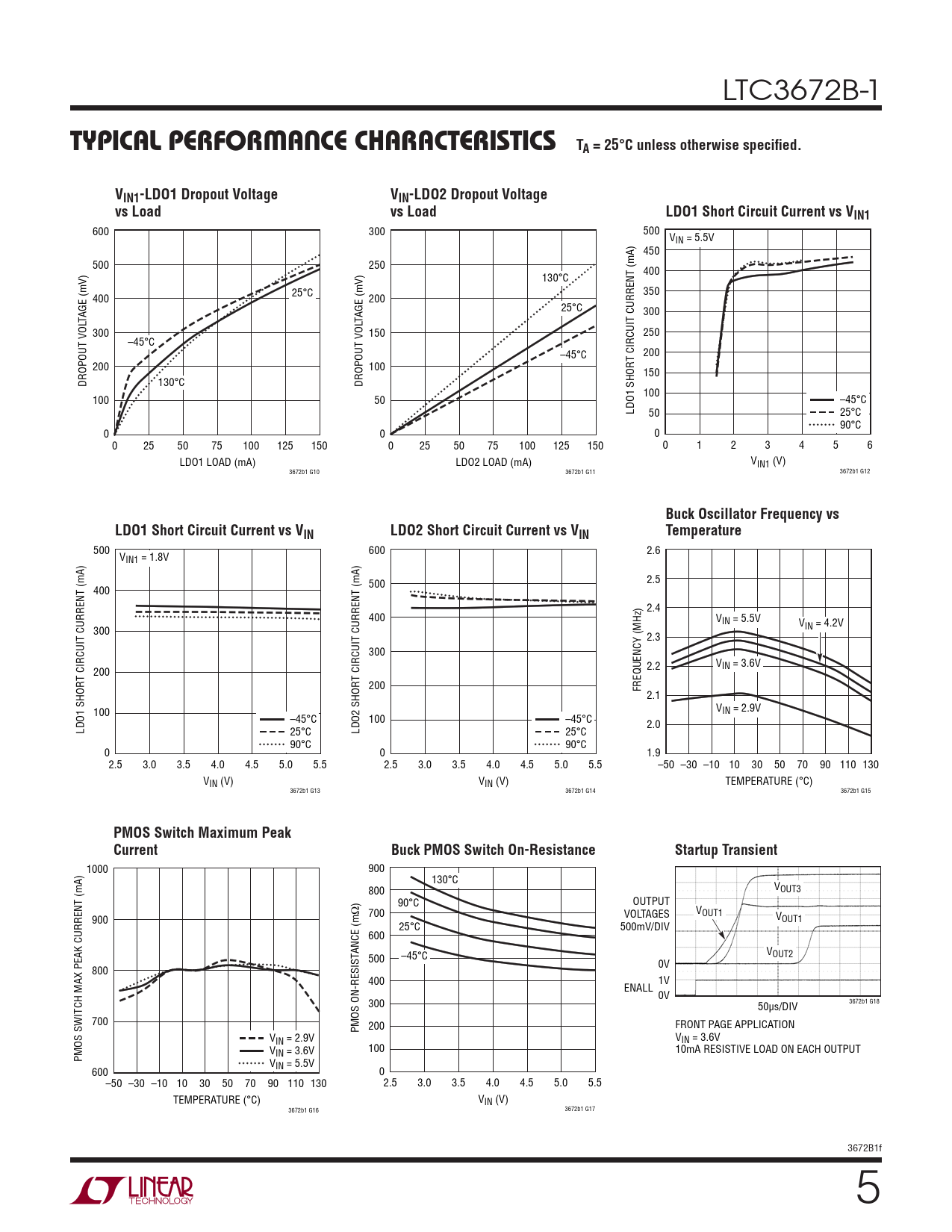 500 600 V 2.6 IN1 = 1.8V 500 2.5 400 2.4 400 VIN = 5.5V V 300 IN = 4.2V 2.3 300 2.2 VIN = 3.6V T CIRCUIT CURRENT (mA) 200 T CIRCUIT CURRENT (mA) 200 FREQUENCY (MHz) 2.1 100 VIN = 2.9V –45°C 100 –45°C LDO1 SHOR 2.0 25°C LDO2 SHOR 25°C 90°C 90°C 0 0 1.9 2.5 3.0 3.5 4.0 4.5 5.0 5.5 2.5 3.0 3.5 4.0 4.5 5.0 5.5 –50 –30 –10 10 30 50 70 90 110 130 VIN (V) VIN (V) TEMPERATURE (°C) 3672b1 G13 3672b1 G14 3672b1 G15