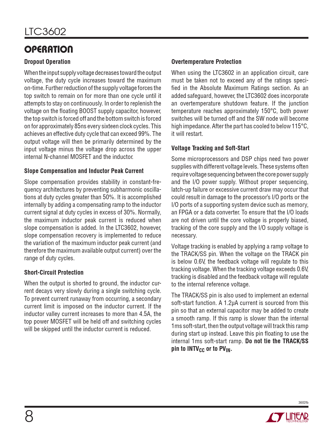 When the input supply voltage decreases toward the output When using the LTC3602 in an application circuit, care voltage, the duty cycle increases toward the maximum must be taken not to exceed any of the ratings speci- on-time. Further reduction of the supply voltage forces the fi ed in the Absolute Maximum Ratings section. As an top switch to remain on for more than one cycle until it added safeguard, however, the LTC3602 does incorporate attempts to stay on continuously. In order to replenish the an overtemperature shutdown feature. If the junction voltage on the fl oating BOOST supply capacitor, however, temperature reaches approximately 150°C, both power the top switch is forced off and the bottom switch is forced switches will be turned off and the SW node will become on for approximately 85ns every sixteen clock cycles. This high impedance. After the part has cooled to below 115°C, achieves an effective duty cycle that can exceed 99%. The it will restart. output voltage will then be primarily determined by the input voltage minus the voltage drop across the upper