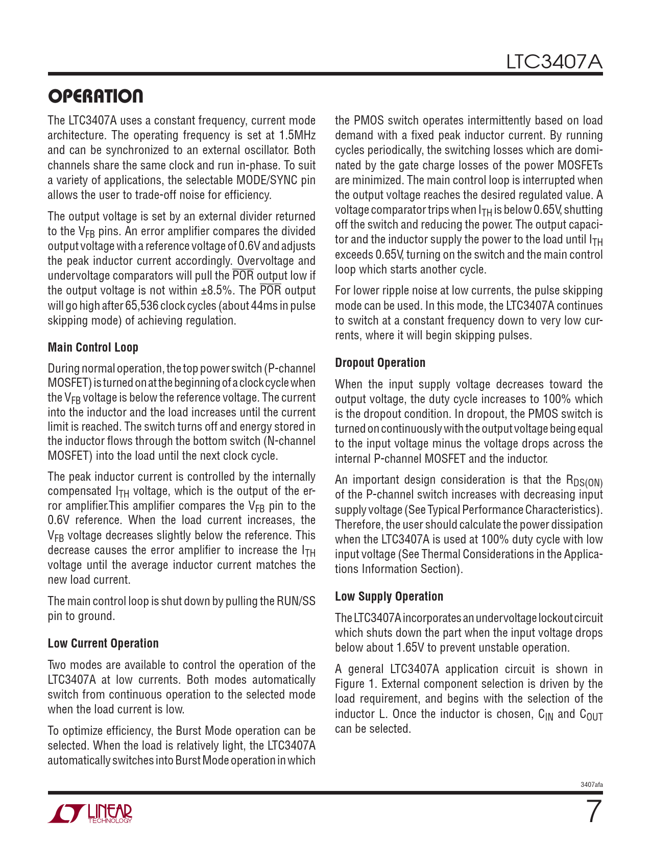 LTC3407A OPERATION The LTC3407A uses a constant frequency, current mode the PMOS switch operates intermittently based on load architecture. The operating frequency is set at 1.5MHz demand with a fi xed peak inductor current. By running and can be synchronized to an external oscillator. Both cycles periodically, the switching losses which are domi- channels share the same clock and run in-phase. To suit nated by the gate charge losses of the power MOSFETs a variety of applications, the selectable MODE/SYNC pin are minimized. The main control loop is interrupted when allows the user to trade-off noise for effi ciency. the output voltage reaches the desired regulated value. A voltage comparator trips when I The output voltage is set by an external divider returned TH is below 0.65V, shutting off the switch and reducing the power. The output capaci- to the VFB pins. An error amplifi er compares the divided tor and the inductor supply the power to the load until I output voltage with a reference voltage of 0.6V and adjusts TH exceeds 0.65V, turning on the switch and the main control the peak inductor current accordingly. Overvoltage and loop which starts another cycle. undervoltage comparators will pull the POR output low if the output voltage is not within ±8.5%. The POR output For lower ripple noise at low currents, the pulse skipping will go high after 65,536 clock cycles (about 44ms in pulse mode can be used. In this mode, the LTC3407A continues skipping mode) of achieving regulation. to switch at a constant frequency down to very low cur- rents, where it will begin skipping pulses. Main Control Loop During normal operation, the top power switch (P-channel Dropout Operation MOSFET) is turned on at the beginning of a clock cycle when When the input supply voltage decreases toward the the VFB voltage is below the reference voltage. The current output voltage, the duty cycle increases to 100% which into the inductor and the load increases until the current is the dropout condition. In dropout, the PMOS switch is limit is reached. The switch turns off and energy stored in turned on continuously with the output voltage being equal the inductor fl ows through the bottom switch (N-channel to the input voltage minus the voltage drops across the MOSFET) into the load until the next clock cycle. internal P-channel MOSFET and the inductor. The peak inductor current is controlled by the internally An important design consideration is that the RDS(ON) compensated ITH voltage, which is the output of the er- of the P-channel switch increases with decreasing input ror amplifi er.This amplifi er compares the VFB pin to the supply voltage (See Typical Performance Characteristics). 0.6V reference. When the load current increases, the Therefore, the user should calculate the power dissipation VFB voltage decreases slightly below the reference. This when the LTC3407A is used at 100% duty cycle with low decrease causes the error amplifi er to increase the ITH input voltage (See Thermal Considerations in the Applica- voltage until the average inductor current matches the tions Information Section). new load current. The main control loop is shut down by pulling the RUN/SS Low Supply Operation pin to ground. The LTC3407A incorporates an undervoltage lockout circuit which shuts down the part when the input voltage drops Low Current Operation below about 1.65V to prevent unstable operation. Two modes are available to control the operation of the A general LTC3407A application circuit is shown in LTC3407A at low currents. Both modes automatically Figure 1. External component selection is driven by the switch from continuous operation to the selected mode load requirement, and begins with the selection of the when the load current is low. inductor L. Once the inductor is chosen, CIN and COUT To optimize effi ciency, the Burst Mode operation can be can be selected. selected. When the load is relatively light, the LTC3407A automatically switches into Burst Mode operation in which 3407afa 7