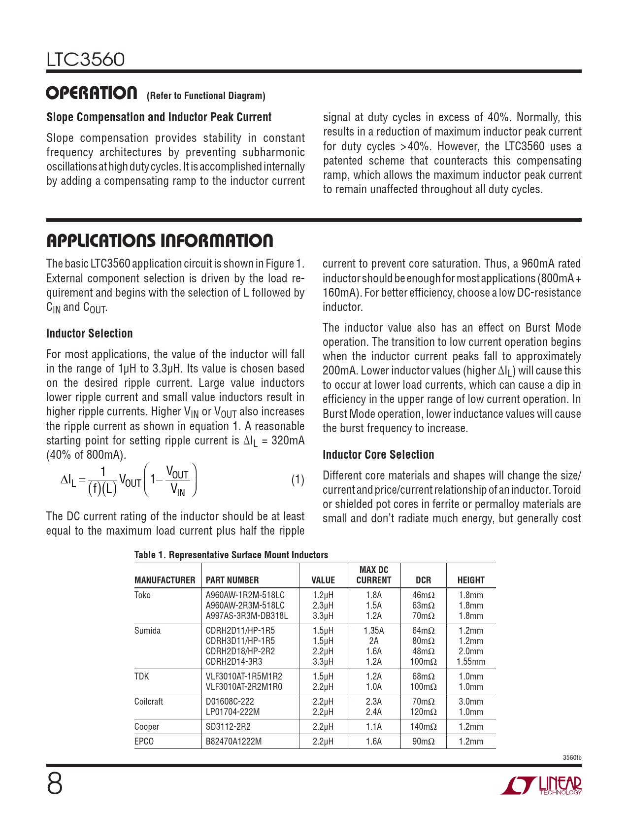 LTC3560 OPERATION (Refer to Functional Diagram)Slope Compensation and Inductor Peak Current signal at duty cycles in excess of 40%. Normally, this results in a reduction of maximum inductor peak current Slope compensation provides stability in constant for duty cycles > 40%. However, the LTC3560 uses a frequency architectures by preventing subharmonic patented scheme that counteracts this compensating oscillations at high duty cycles. It is accomplished internally ramp, which allows the maximum inductor peak current by adding a compensating ramp to the inductor current to remain unaffected throughout all duty cycles. APPLICATIONS INFORMATION The basic LTC3560 application circuit is shown in Figure 1. current to prevent core saturation. Thus, a 960mA rated External component selection is driven by the load re- inductor should be enough for most applications (800mA + quirement and begins with the selection of L followed by 160mA). For better effi ciency, choose a low DC-resistance CIN and COUT. inductor. The inductor value also has an effect on Burst Mode Inductor Selection operation. The transition to low current operation begins For most applications, the value of the inductor will fall when the inductor current peaks fall to approximately in the range of 1μH to 3.3μH. Its value is chosen based 200mA. Lower inductor values (higher ΔIL) will cause this on the desired ripple current. Large value inductors to occur at lower load currents, which can cause a dip in lower ripple current and small value inductors result in effi ciency in the upper range of low current operation. In higher ripple currents. Higher VIN or VOUT also increases Burst Mode operation, lower inductance values will cause the ripple current as shown in equation 1. A reasonable the burst frequency to increase. starting point for setting ripple current is ΔIL = 320mA (40% of 800mA). Inductor Core Selection I = 1 Different core materials and shapes will change the size/ L (f) L() VOUT 1 VOUT V (1) current and price/current relationship of an inductor. Toroid IN or shielded pot cores in ferrite or permalloy materials are The DC current rating of the inductor should be at least small and don’t radiate much energy, but generally cost equal to the maximum load current plus half the ripple Table 1. Representative Surface Mount InductorsMAX DCMANUFACTURERPART NUMBERVALUECURRENTDCRHEIGHT Toko A960AW-1R2M-518LC 1.2μH 1.8A 46mΩ 1.8mm A960AW-2R3M-518LC 2.3μH 1.5A 63mΩ 1.8mm A997AS-3R3M-DB318L 3.3μH 1.2A 70mΩ 1.8mm Sumida CDRH2D11/HP-1R5 1.5μH 1.35A 64mΩ 1.2mm CDRH3D11/HP-1R5 1.5μH 2A 80mΩ 1.2mm CDRH2D18/HP-2R2 2.2μH 1.6A 48mΩ 2.0mm CDRH2D14-3R3 3.3μH 1.2A 100mΩ 1.55mm TDK VLF3010AT-1R5M1R2 1.5μH 1.2A 68mΩ 1.0mm VLF3010AT-2R2M1R0 2.2μH 1.0A 100mΩ 1.0mm Coilcraft D01608C-222 2.2μH 2.3A 70mΩ 3.0mm LP01704-222M 2.2μH 2.4A 120mΩ 1.0mm Cooper SD3112-2R2 2.2μH 1.1A 140mΩ 1.2mm EPCO B82470A1222M 2.2μH 1.6A 90mΩ 1.2mm 3560fb 8