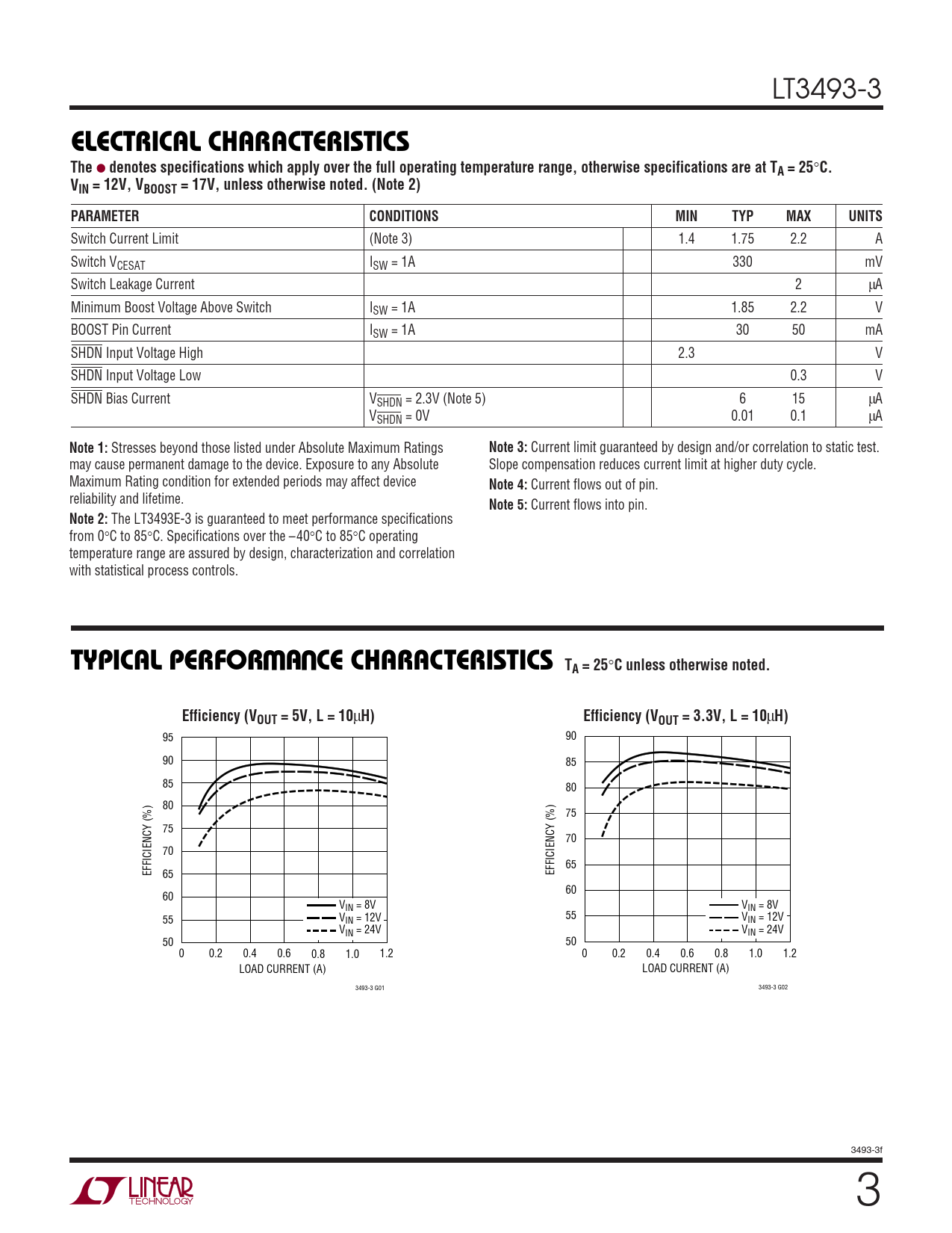 95 90 90 85 85 80 80 75 75 70 70 65 EFFICIENCY (%) EFFICIENCY (%) 65 60 60 V V IN = 8V IN = 8V V 55 V 55 IN = 12V IN = 12V V V IN = 24V IN = 24V 50 50 0 0.2 0.4 0.6 0.8 1.0 1.2 0 0.2 0.4 0.6 0.8 1.0 1.2 LOAD CURRENT (A) LOAD CURRENT (A) 3493-3 G01 3493-3 G02 3493-3f 3