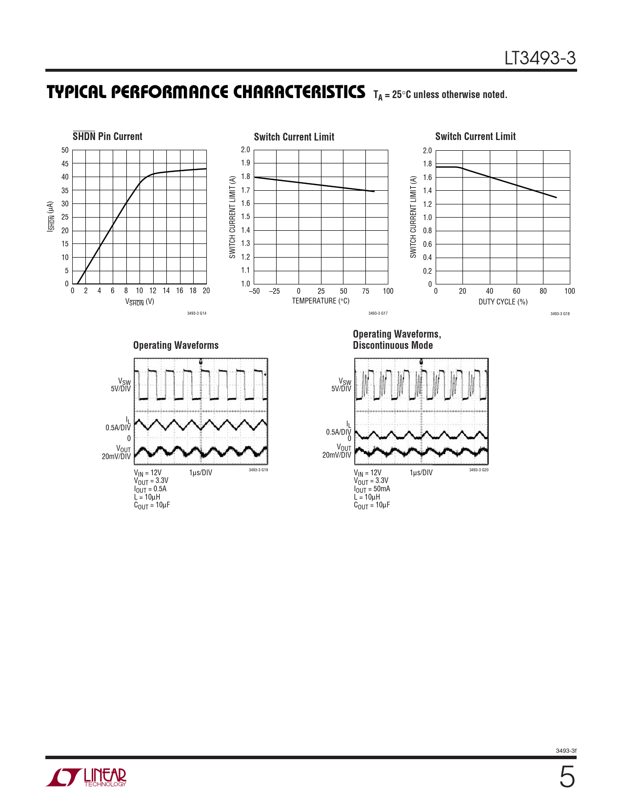 VSW VSW 5V/DIV 5V/DIV IL I 0.5A/DIV L 0.5A/DIV 0 0 V V OUT OUT 20mV/DIV 20mV/DIV VIN = 12V 1µs/DIV 3493-3 G19 1µs/DIV 3493-3 G20 VIN = 12V VOUT = 3.3V VOUT = 3.3V IOUT = 0.5A IOUT = 50mA L = 10µH L = 10µH COUT = 10µF COUT = 10µF 3493-3f 5