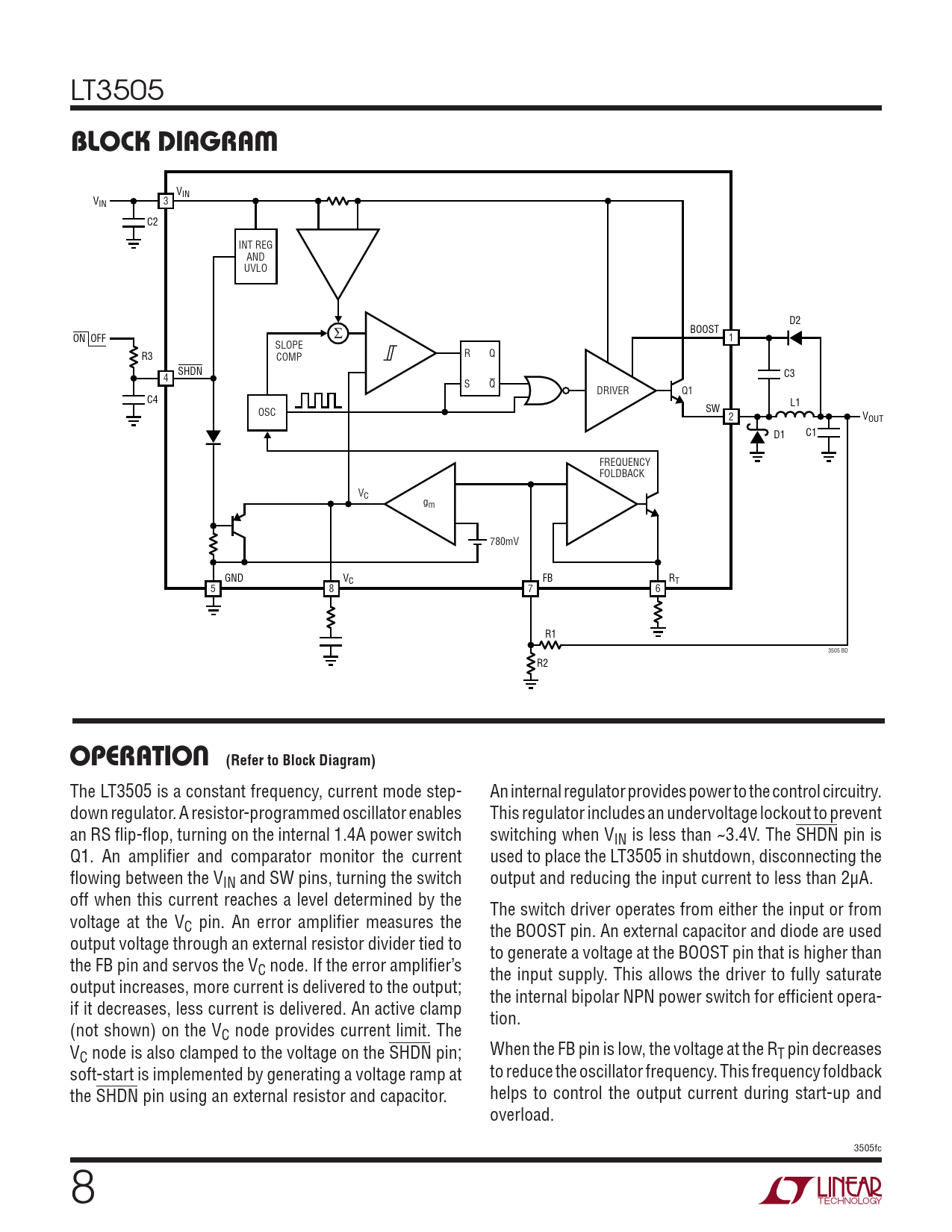 LT3505 BLOCK DIAGRAM VIN VIN 3 C2 INT REG AND UVLO D2 ON OFF Σ BOOST 1 SLOPE R R3 COMP Q SHDN 4 C3 S Q DRIVER Q1 C4 L1 OSC SW 2 VOUT D1 C1 FREQUENCY FOLDBACK VC gm 780mV GND VC FB RT 5 8 7 6 R1 3505 BD R2 OPERATION