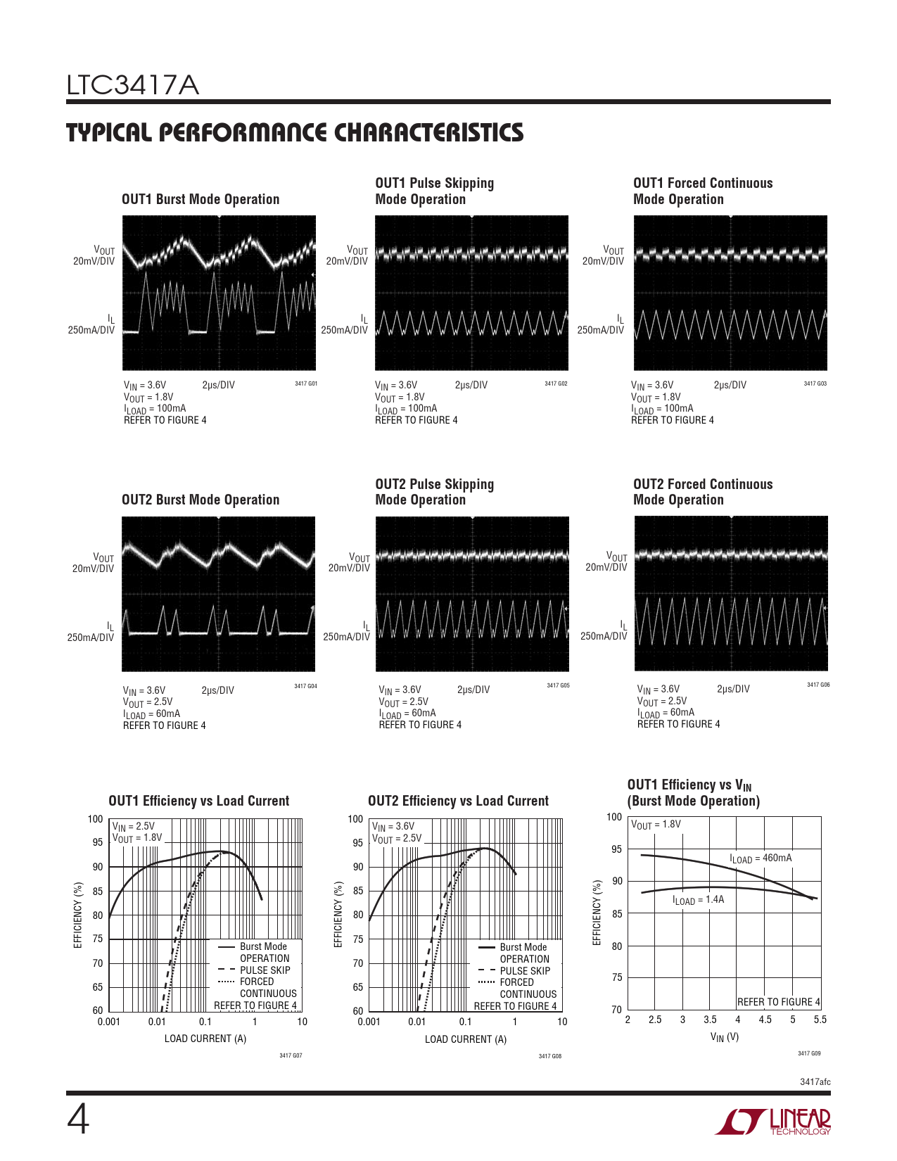 100 100 100 VIN = 2.5V VIN = 3.6V VOUT = 1.8V 95 VOUT = 1.8V 95 VOUT = 2.5V 95 ILOAD = 460mA 90 90 90 85 85 ILOAD = 1.4A 80 80 85 EFFICIENCY (%) 75 75 Burst Mode EFFICIENCY (%) Burst Mode EFFICIENCY (%) 80 70 OPERATION 70 OPERATION PULSE SKIP PULSE SKIP 75 65 FORCED 65 FORCED CONTINUOUS CONTINUOUS REFER TO FIGURE 4 60 REFER TO FIGURE 4 60 REFER TO FIGURE 4 70 0.001 0.01 0.1 1 10 0.001 0.01 0.1 1 10 2 2.5 3 3.5 4 4.5 5 5.5 LOAD CURRENT (A) LOAD CURRENT (A) VIN (V) 3417 G07 3417 G08 3417 G09 3417afc 4 Document Outline Features Description Applications Typical Application Absolute Maximum Ratings Pin Configuration Electrical Characteristics Typical Performance Characteristics Pin Functions Functional Diagram Operation Applications Information Package Description Revision History Related Parts