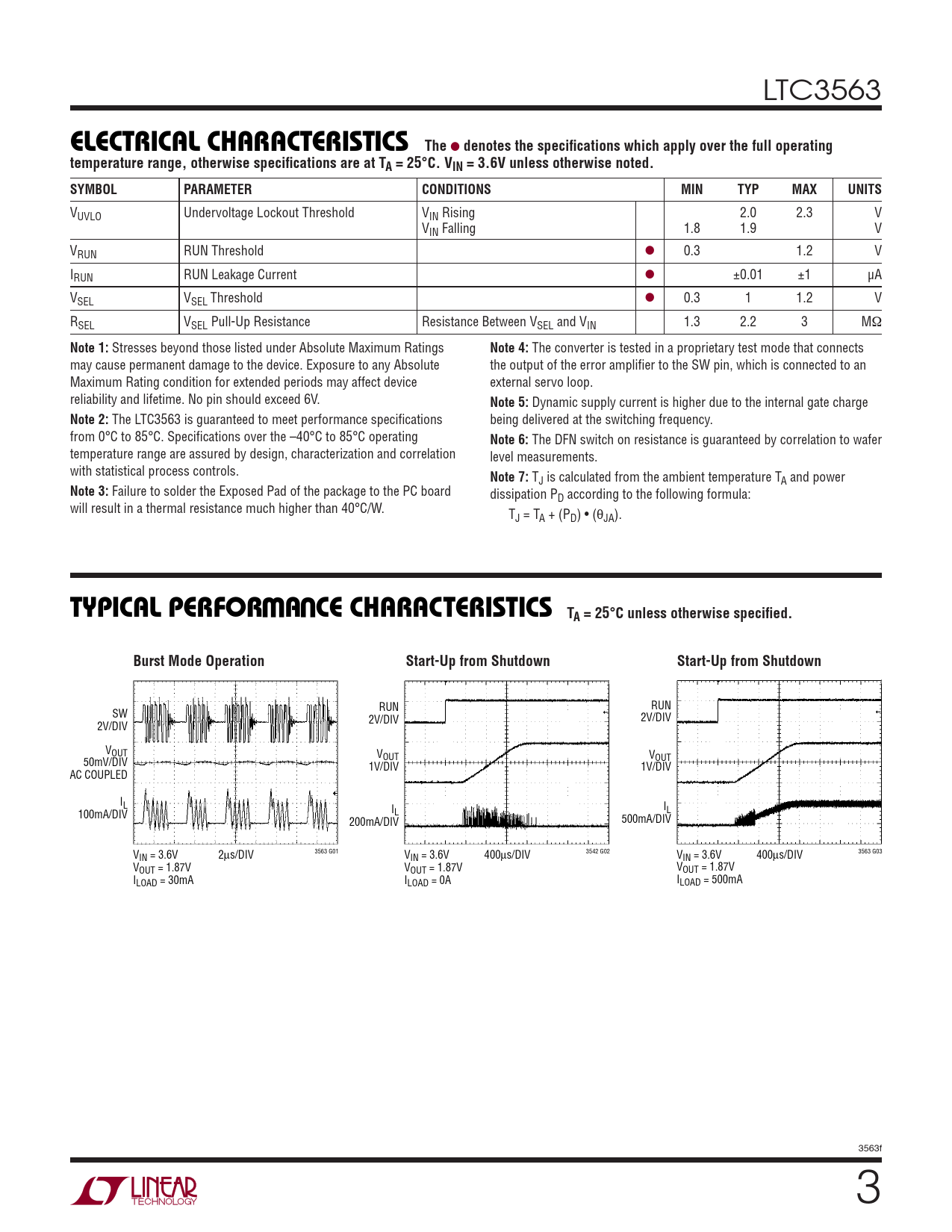 LTC3563 TheELECTRICAL CHARACTERISTICS ● denotes the specifi cations which apply over the full operatingtemperature range, otherwise specifi cations are at TA = 25°C. VIN = 3.6V unless otherwise noted.SYMBOLPARAMETERCONDITIONSMINTYPMAXUNITS VUVLO Undervoltage Lockout Threshold VIN Rising 2.0 2.3 V VIN Falling 1.8 1.9 V VRUN RUN Threshold ● 0.3 1.2 V IRUN RUN Leakage Current ● ±0.01 ±1 µA VSEL VSEL Threshold ● 0.3 1 1.2 V RSEL VSEL Pull-Up Resistance Resistance Between VSEL and VIN 1.3 2.2 3 MΩ Note 1: Stresses beyond those listed under Absolute Maximum Ratings Note 4: The converter is tested in a proprietary test mode that connects may cause permanent damage to the device. Exposure to any Absolute the output of the error amplifi er to the SW pin, which is connected to an Maximum Rating condition for extended periods may affect device external servo loop. reliability and lifetime. No pin should exceed 6V. Note 5: Dynamic supply current is higher due to the internal gate charge Note 2: The LTC3563 is guaranteed to meet performance specifi cations being delivered at the switching frequency. from 0°C to 85°C. Specifi cations over the –40°C to 85°C operating Note 6: The DFN switch on resistance is guaranteed by correlation to wafer temperature range are assured by design, characterization and correlation level measurements. with statistical process controls. Note 7: TJ is calculated from the ambient temperature TA and power Note 3: Failure to solder the Exposed Pad of the package to the PC board dissipation PD according to the following formula: will result in a thermal resistance much higher than 40°C/W. TJ = TA + (PD) • (θJA). WUTYPICAL PERFOR A CE CHARACTERISTICS TA = 25°C unless otherwise specifi ed.Burst Mode OperationStart-Up from ShutdownStart-Up from Shutdown RUN RUN SW 2V/DIV 2V/DIV 2V/DIV VOUT VOUT VOUT 50mV/DIV 1V/DIV 1V/DIV AC COUPLED IL IL 100mA/DIV IL 200mA/DIV 500mA/DIV VIN = 3.6V 2µs/DIV 3563 G01 VIN = 3.6V 400µs/DIV 3542 G02 VIN = 3.6V 400µs/DIV 3563 G03 VOUT = 1.87V VOUT = 1.87V VOUT = 1.87V ILOAD = 30mA ILOAD = 0A ILOAD = 500mA 3563f 3