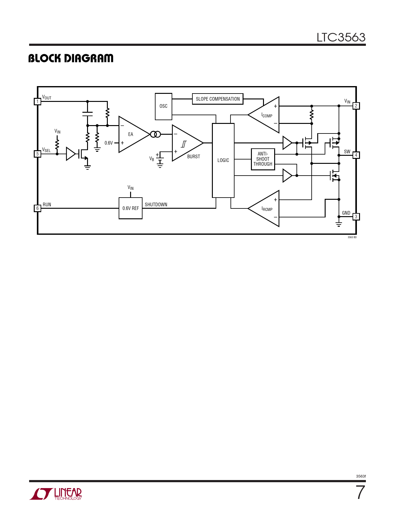 VOUT SLOPE COMPENSATION 1 VIN OSC + 2 ICOMP – – V – IN EA + 0.6V V + SEL 5 + SW ANTI- 4 V BURST B SHOOT LOGIC THROUGH VIN + RUN SHUTDOWN 6 0.6V REF IRCMP GND – 3 3563 BD 3563f 7