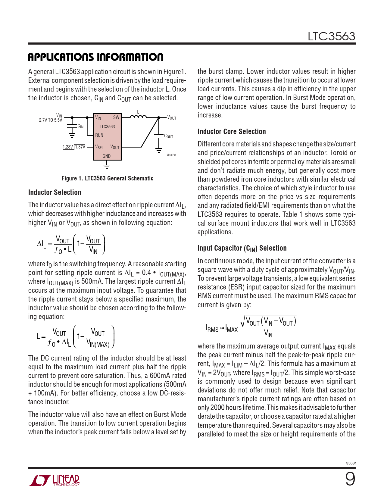 LTC3563 UUWUAPPLICATIO S I FOR ATIO A general LTC3563 application circuit is shown in Figure1. the burst clamp. Lower inductor values result in higher External component selection is driven by the load require- ripple current which causes the transition to occur at lower ment and begins with the selection of the inductor L. Once load currents. This causes a dip in effi ciency in the upper the inductor is chosen, CIN and COUT can be selected. range of low current operation. In Burst Mode operation, lower inductance values cause the burst frequency to L VIN V SW V increase. IN 2.7V TO 5.5V OUT CIN LTC3563 Inductor Core Selection RUN COUT 1.28V 1.87V V Different core materials and shapes change the size/current SEL VOUT 3563 F01 and price/current relationships of an inductor. Toroid or GND shielded pot cores in ferrite or permalloy materials are small and don’t radiate much energy, but generally cost more Figure 1. LTC3563 General Schematic than powdered iron core inductors with similar electrical characteristics. The choice of which style inductor to use Inductor Selection often depends more on the price vs size requirements The inductor value has a direct effect on ripple current ΔIL, and any radiated fi eld/EMI requirements than on what the which decreases with higher inductance and increases with LTC3563 requires to operate. Table 1 shows some typi- higher VIN or VOUT, as shown in following equation: cal surface mount inductors that work well in LTC3563 applications. V ⎛ V ⎞ ∆I OUT OUT L = – 1 L ⎝⎜ V Input Capacitor (C ⎠⎟ ƒ • IN) Selection O IN In continuous mode, the input current of the converter is a where fO is the switching frequency. A reasonable starting square wave with a duty cycle of approximately VOUT/VIN. point for setting ripple current is ΔIL = 0.4 • IOUT(MAX), To prevent large voltage transients, a low equivalent series where IOUT(MAX) is 500mA. The largest ripple current ΔIL resistance (ESR) input capacitor sized for the maximum occurs at the maximum input voltage. To guarantee that RMS current must be used. The maximum RMS capacitor the ripple current stays below a specifi ed maximum, the current is given by: inductor value should be chosen according to the follow- ing equation: V V – V ( ) OUT IN OUT I ≈I ⎛ ⎞ RMS MAX V V OUT OUT VIN L = ⎜ – 1 ⎟ ƒ • I ∆ V O L ⎝ IN MA ( X) ⎠ where the maximum average output current IMAX equals the peak current minus half the peak-to-peak ripple cur- The DC current rating of the inductor should be at least rent, IMAX = ILIM – ΔIL/2. This formula has a maximum at equal to the maximum load current plus half the ripple VIN = 2VOUT, where IRMS = IOUT/2. This simple worst-case current to prevent core saturation. Thus, a 600mA rated is commonly used to design because even signifi cant inductor should be enough for most applications (500mA deviations do not offer much relief. Note that capacitor + 100mA). For better effi ciency, choose a low DC-resis- manufacturer’s ripple current ratings are often based on tance inductor. only 2000 hours life time. This makes it advisable to further The inductor value will also have an effect on Burst Mode derate the capacitor, or choose a capacitor rated at a higher operation. The transition to low current operation begins temperature than required. Several capacitors may also be when the inductor’s peak current falls below a level set by paralleled to meet the size or height requirements of the 3563f 9