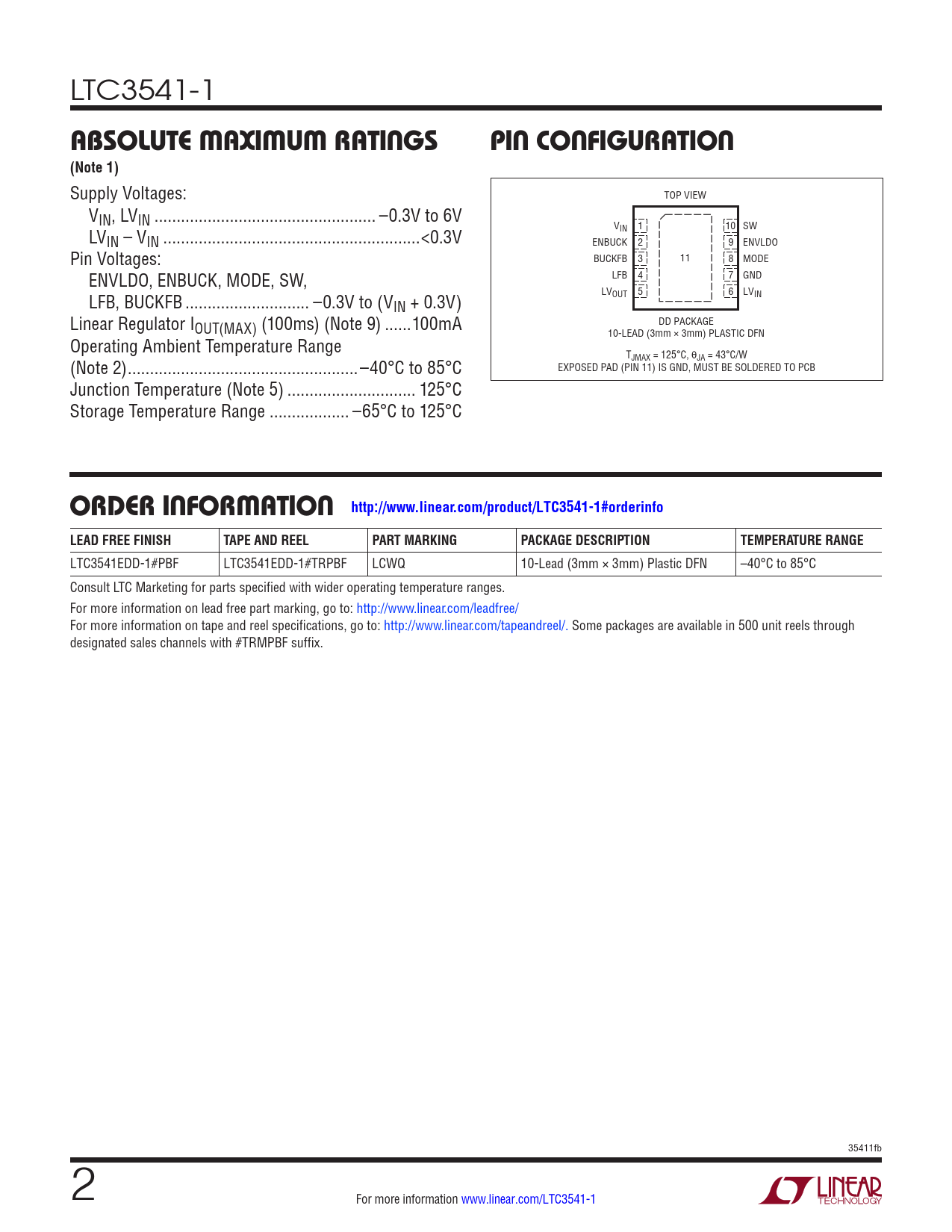LTC3541EDD-1#PBF LTC3541EDD-1#TRPBF LCWQ 10-Lead (3mm × 3mm) Plastic DFN –40°C to 85°C Consult LTC Marketing for parts specified with wider operating temperature ranges. For more information on lead free part marking, go to: http://www.linear.com/leadfree/ For more information on tape and reel specifications, go to: http://www.linear.com/tapeandreel/. Some packages are available in 500 unit reels through designated sales channels with #TRMPBF suffix. 35411fb 2 For more information www.linear.com/LTC3541-1 Document Outline Features Applications Typical Application Description Absolute Maximum Ratings Order Information Pin Configuration Electrical Characteristics Typical Performance Characteristics Pin Functions Block Diagram Operation Applications Information Package Description Revision History Related Parts