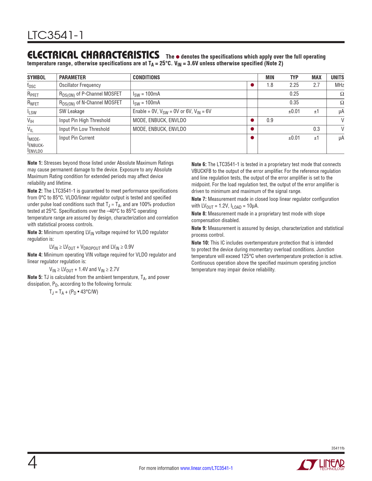 denotes the specifications which apply over the full operating temperature range, otherwise specifications are at TA = 25°C. VIN = 3.6V unless otherwise specified (Note 2) SYMBOL PARAMETER CONDITIONS MIN TYP MAX UNITS