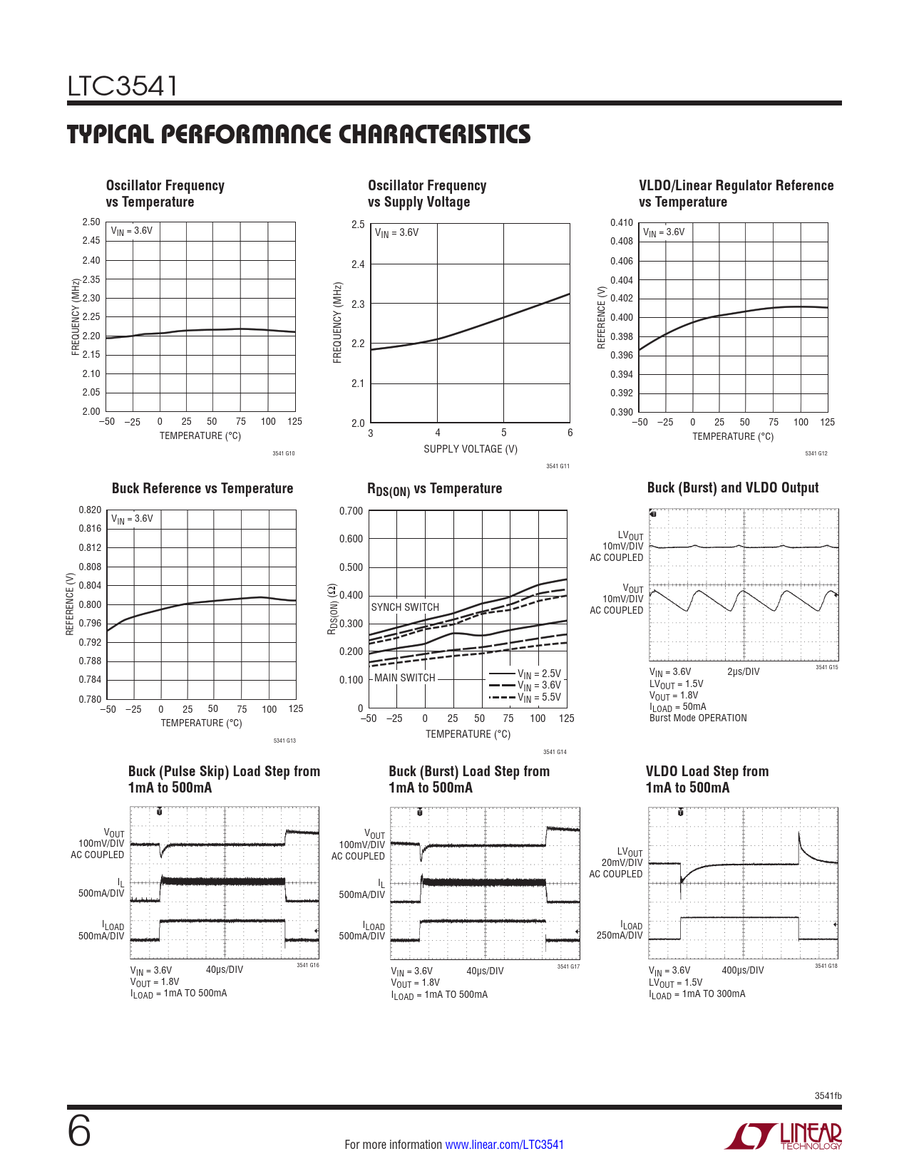 2.50 0.410 V 2.5 IN = 3.6V V V 2.45 IN = 3.6V IN = 3.6V 0.408 2.40 2.4 0.406 2.35 0.404 2.30 2.3 0.402 2.25 0.400 2.20 0.398 2.2 REFERENCE (V) FREQUENCY (MHz) 2.15 FREQUENCY (MHz) 0.396 2.10 0.394 2.1 2.05 0.392 2.00 0.390 –50 –25 0 25 50 75 100 125 2.0 –50 –25 0 25 50 75 100 125 TEMPERATURE (°C) 3 4 5 6 TEMPERATURE (°C) SUPPLY VOLTAGE (V) 3541 G10 5341 G12 3541 G11